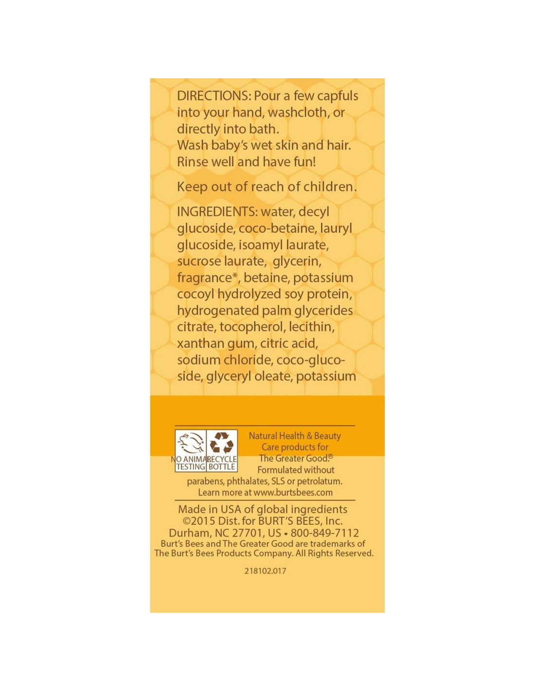 Champú y Lavado para Bebés de Burt's Bees, Original, 12 Onzas (355 ml). Para Usar: Vierte unos pocos tapones en tu mano, sobre un paño de lavado, o directamente en la bañera. Lava la piel y el cabello húmedo del bebé. Enjuaga. Mantener fuera del alcance de los niños.