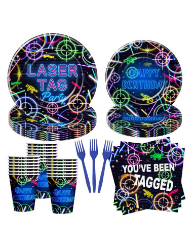 - [Sirve a 24 Invitados] Este juego de utensilios de decoración de cumpleaños de laser tag puede acomodar hasta 24 invitados e incluye todo lo que necesitas: 24 platos de cena de laser tag de 9'' (22,86 cm), 24 platos de postre de laser tag de 7'' (17,78 cm), 24 servilletas, 24 tazas, 24 juegos de tenedores desechables. Consigue estas decoraciones de fiesta de laser tag para elevar tu celebración