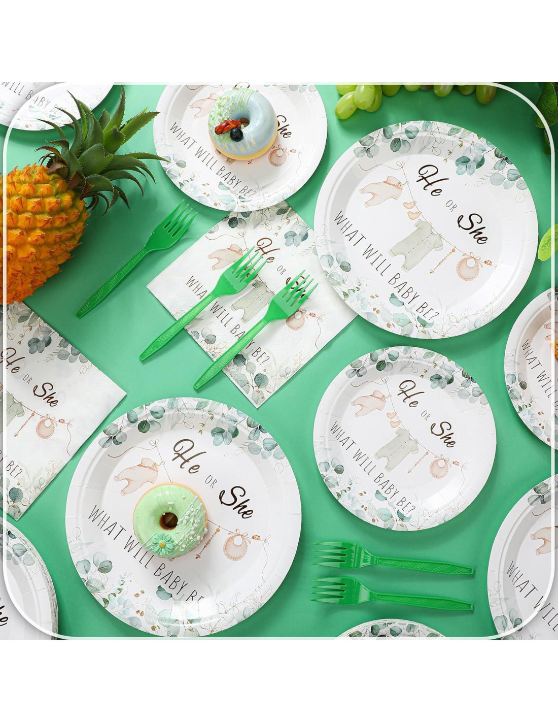 - Suministros para Fiesta de Baby Shower Verde: recibirás 24 piezas de platos de revelación de género de 9 pulgadas (22,86 cm), 24 piezas de platos pequeños de 7 pulgadas (17,78 cm), 24 servilletas y 24 tenedores; Este conjunto de suministros para fiesta de baby shower verde totaliza 96 piezas, trayendo sorpresas para ti, tu familia y amigos