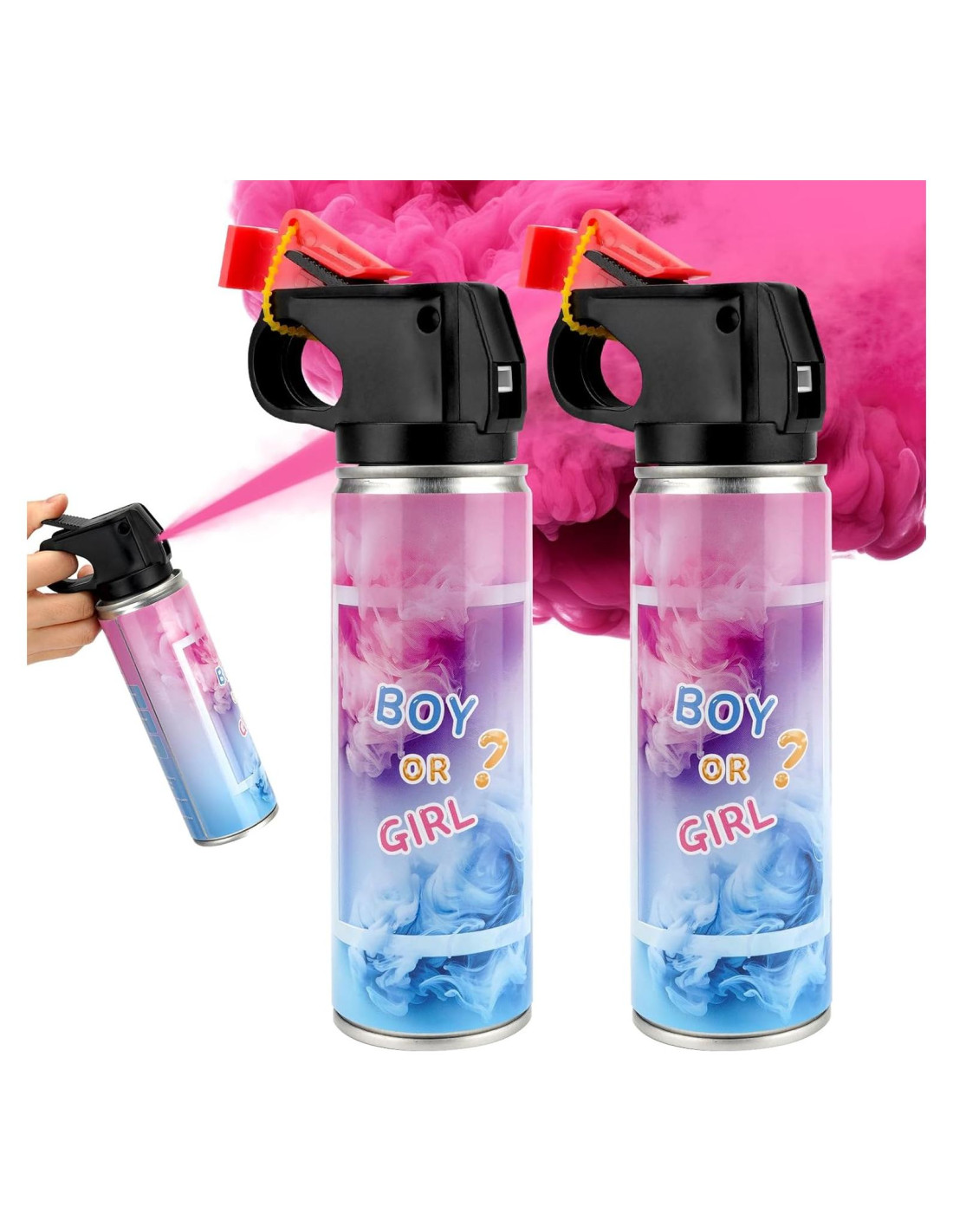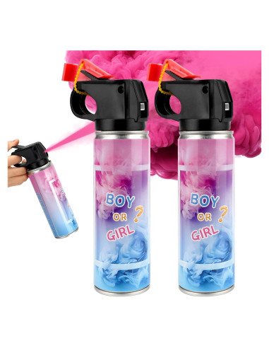 - ¿Niño o Niña? Agita nuestro extintor de revelación de género antes de quitar el pasador de seguridad, luego presiona, rociará (hay un punto rosa o azul en la parte inferior de los frascos)