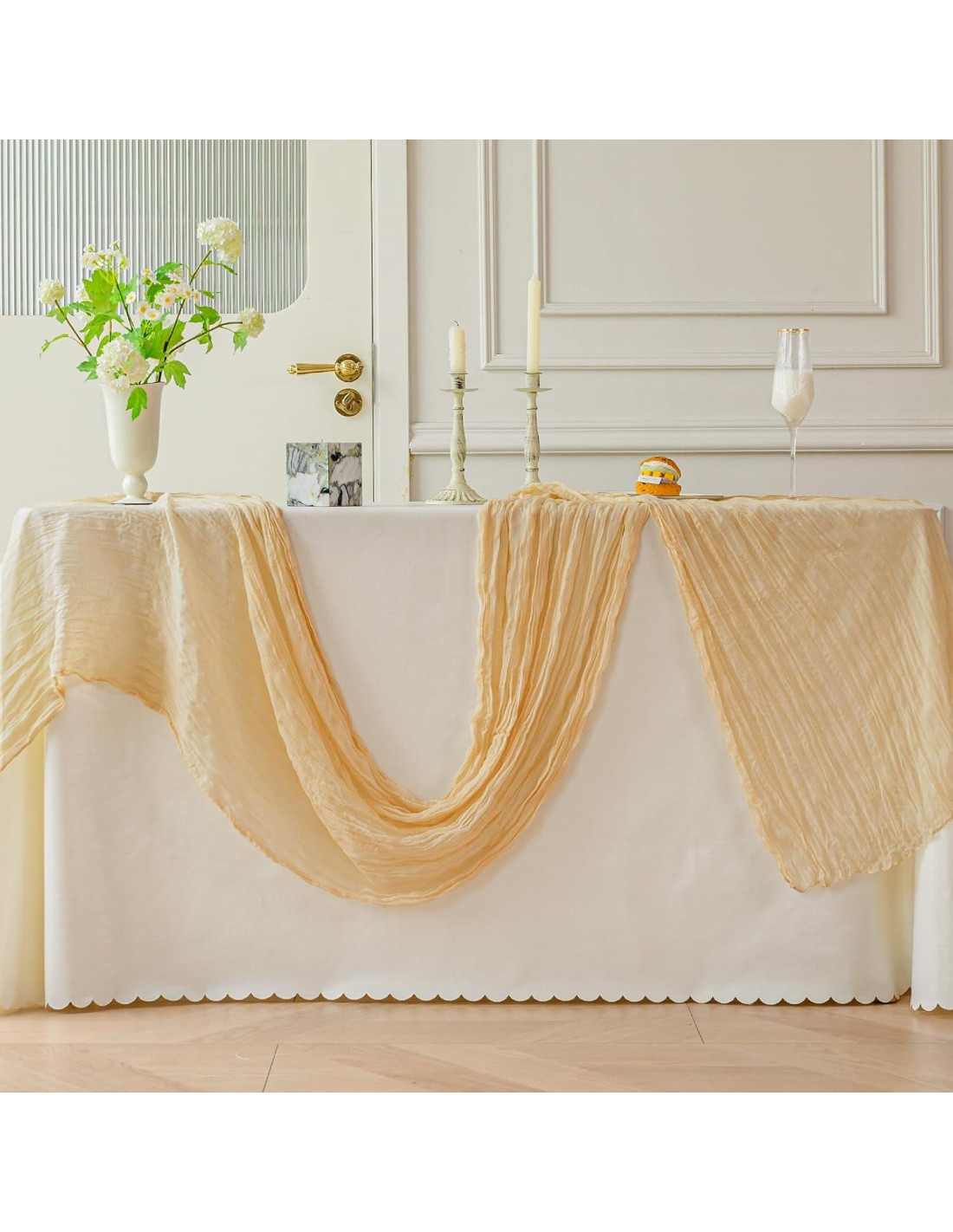 - USO AMPLIO - El caminito de mesa de gasa es una decoración multifuncional y es adecuado para varias ocasiones, como bodas, ceremonia de compromiso, banquetes, fiesta de cumpleaños, baby shower, cenas, recepciones, buffets de dulces, mesas de postres, celebraciones, ceremonias, fiesta temática, Navidad, Día de San Valentín, Pascua, Acción de Gracias y muchas más festividades.
