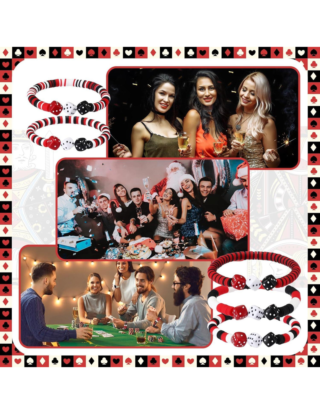 - Conjunto de Fiesta de Casino: nuestro paquete incluye 20 pulseras de arcilla polimérica (5 estilos) y 20 tarjetas temáticas de póker; Las pulseras y tarjetas son de color negro, rojo y blanco, que se ajustan al póker, dados y otros elementos de la fiesta de casino y añaden atmósfera a su fiesta