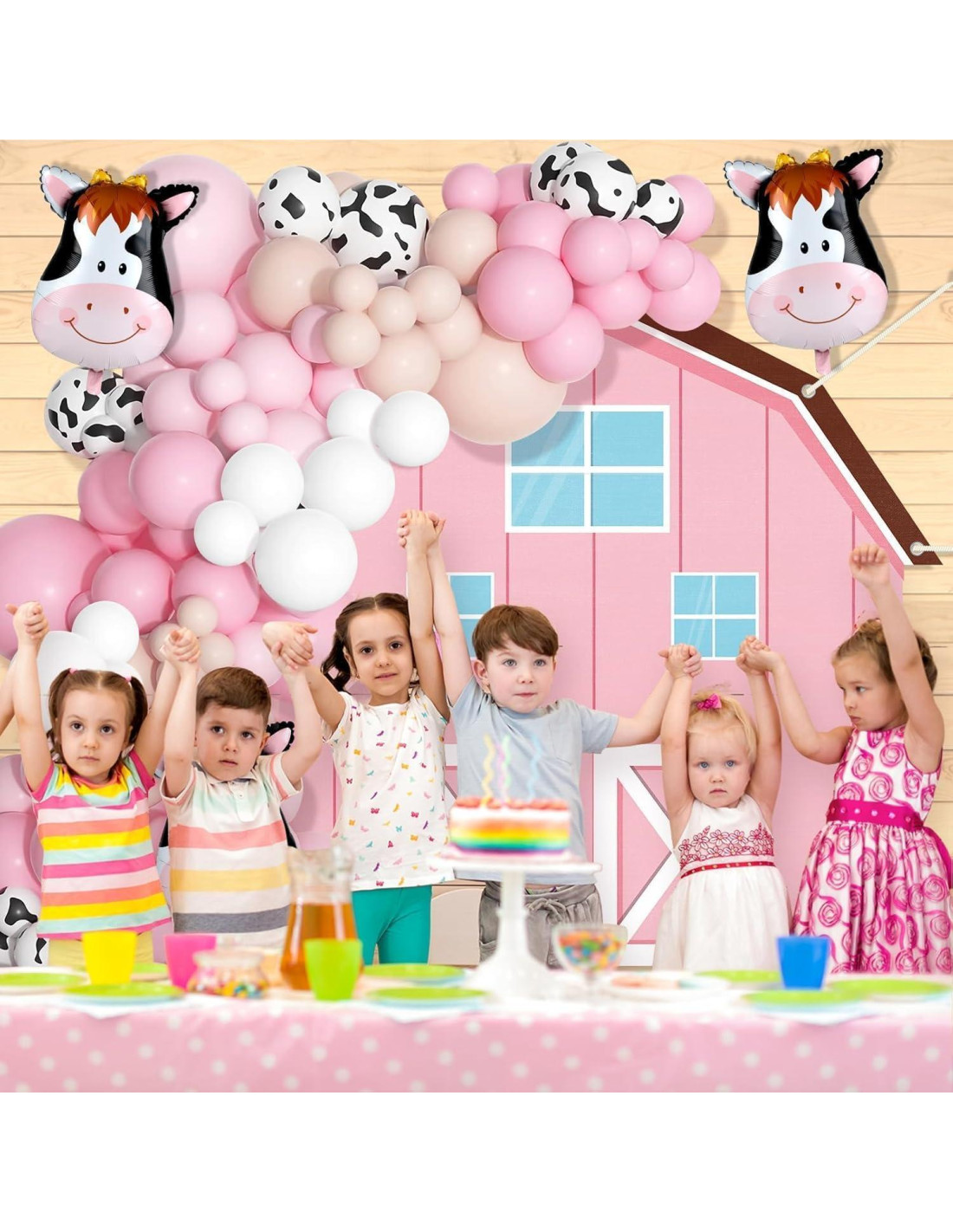 - El paquete incluye: Obtendrás 60 piezas de globos de 10 pulgadas (25,4 cm) en 4 colores (rosa, blanco, blanco roto, rosa bebé), 40 piezas de globos de 5 pulgadas (12,7 cm) en 4 colores, 8 piezas de globos de 12 pulgadas (30,48 cm) con estampado de vaca, 4 piezas de globos de foil de vaca de 16 pulgadas (40,64 cm), 1 pieza de fondo de granja rojo (58.3 x 58.1 pulgadas / 148 x 141 cm), 1 pieza de cuerda blanca, 1 pieza de tira de globos de 16.4 pies (5 m) y 100 piezas de puntos adhesivos. Patrones ricos y cantidades suficientes ayudan a crear una decoración auténtica de fiesta de granja.