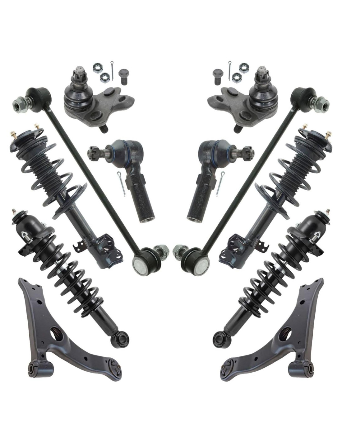 Especificaciones del artículo: Cantidad: Kit de 12 piezas Incluye: (2) Juntas de bola inferiores delanteras, (2) Brazos de control inferiores delanteros, (2) Varillas de dirección exteriores delanteras, (2) Enlaces de barra estabilizadora delanteros, (2) Ensambles de amortiguador y resorte delanteros, (2) Ensambles de amortiguador y resorte traseros Nota: Al reemplazar componentes de dirección, se recomienda realizar una alineación profesional en el vehículo después. Esto asegurará un seguimiento adecuado y un desgaste uniforme de los neumáticos. Cada ensamble completo de amortiguador y resorte consiste en: Montaje de amortiguador, Rodamiento de amortiguador, Resorte de bobina, Kit de bota de amortiguador. Estas piezas de dirección y suspensión vienen preengrasadas, selladas y no requieren mantenimiento. Compatible con: Toyota Corolla LE Eco 2019 excluyendo modelos fabricados en Japón. Compatible con: Toyota Corolla L Sedan L4 1.8L 2019 Delante y detrás. Compatible con: Toyota Corolla LE Sedan L4 1.8L 2019 Delante y detrás. Compatible con: Toyota Corolla XLE Sedan L4 1.8L 2019 Delante y detrás. Compatible con: Toyota Corolla SE Sedan L4 1.8L 2019 Delante y detrás. Compatible con: Toyota Corolla XSE Sedan L4 1.8L 2019 Delante y detrás. Compatible con: Toyota Corolla 2015-18 Delante y detrás. Compatible con: Toyota Corolla S 2014 Delante y detrás. Compatible con: Toyota Corolla L 2014 Delante y detrás. Compatible con: Toyota Corolla LE 2014 Delante y detrás. Compatible con: Toyota Corolla Le Eco Plus 2014 Delante y detrás.