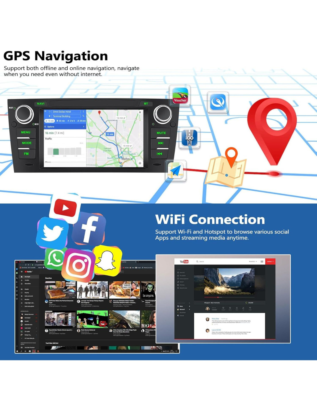 - [CONEXIÓN WIFI Y NAVEGACIÓN GPS] - El estéreo de automóvil se basa en la posición GPS y soporta mapas como Sygic, Kudos, IGo, Google Map, etc. Después de conectarte con WiFi o hotspot móvil, puedes elegir libremente tus aplicaciones de navegación favoritas y descargarlas del mercado de Android