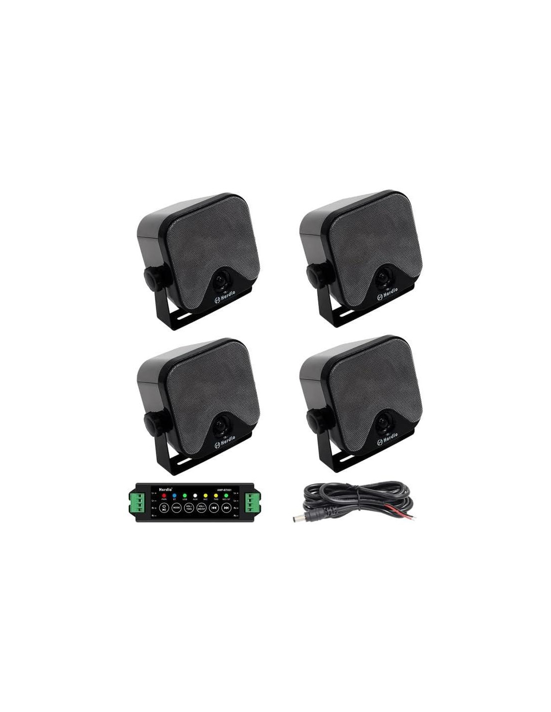 - Componentes incluidos: 1 amplificador, 1 cable de alimentación, 4 altavoces marinos con soportes de montaje, un juego de tornillos