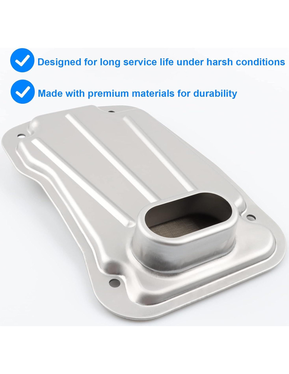 - KIT DE FILTRO DE TRANSMISIÓN AUTOMÁTICA DE REEMPLAZO: El filtro de transmisión automática en línea mantiene los contaminantes fuera del fluido de transmisión. Hay una serie de problemas que pueden surgir con el filtro, lo que reduce su capacidad para hacer su trabajo correctamente. Los síntomas de un filtro de transmisión defectuoso son ruido inusual, fugas, contaminación, incapacidad para cambiar de marcha, humo, por favor tómate un minuto para revisar el filtro de transmisión.
