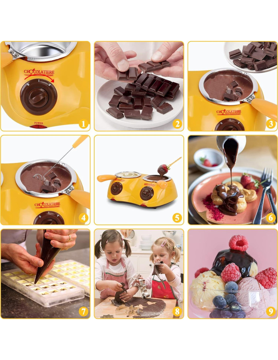 - FÁCIL OPERACIÓN - En lugar del método tradicional de calentamiento por aislamiento de agua, esta olla de fusión mejorada, no necesita agua, solo derrite directamente el chocolate (materia prima). Si las materias primas son grandes, deben ser picadas en trozos pequeños, luego poner en la olla.