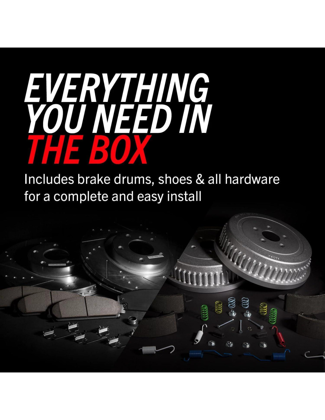 - El Kit de Pastillas de Freno, Rotor, Tambor y Zapata Z23 Delantero y Trasero incluye: 2 rotores de freno delanteros perforados y ranurados + 2 tambores de freno traseros + 1 juego de pastillas de freno de cerámica de fibra de carbono delantero con hardware + 1 juego de zapatas de freno traseras con kit de sujeción y ajustador
