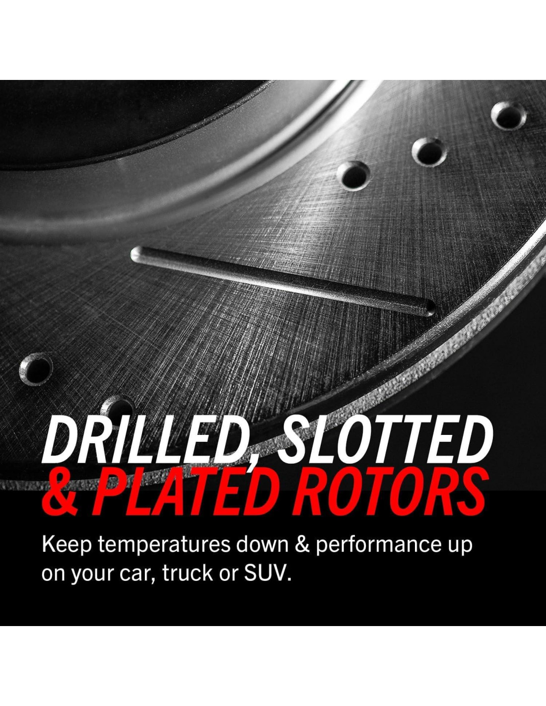 - Los rotores de freno perforados y ranurados proporcionan la máxima refrigeración del freno y cuentan con un recubrimiento de Zinc Dicroamato Plateado que protege contra el óxido y la corrosión