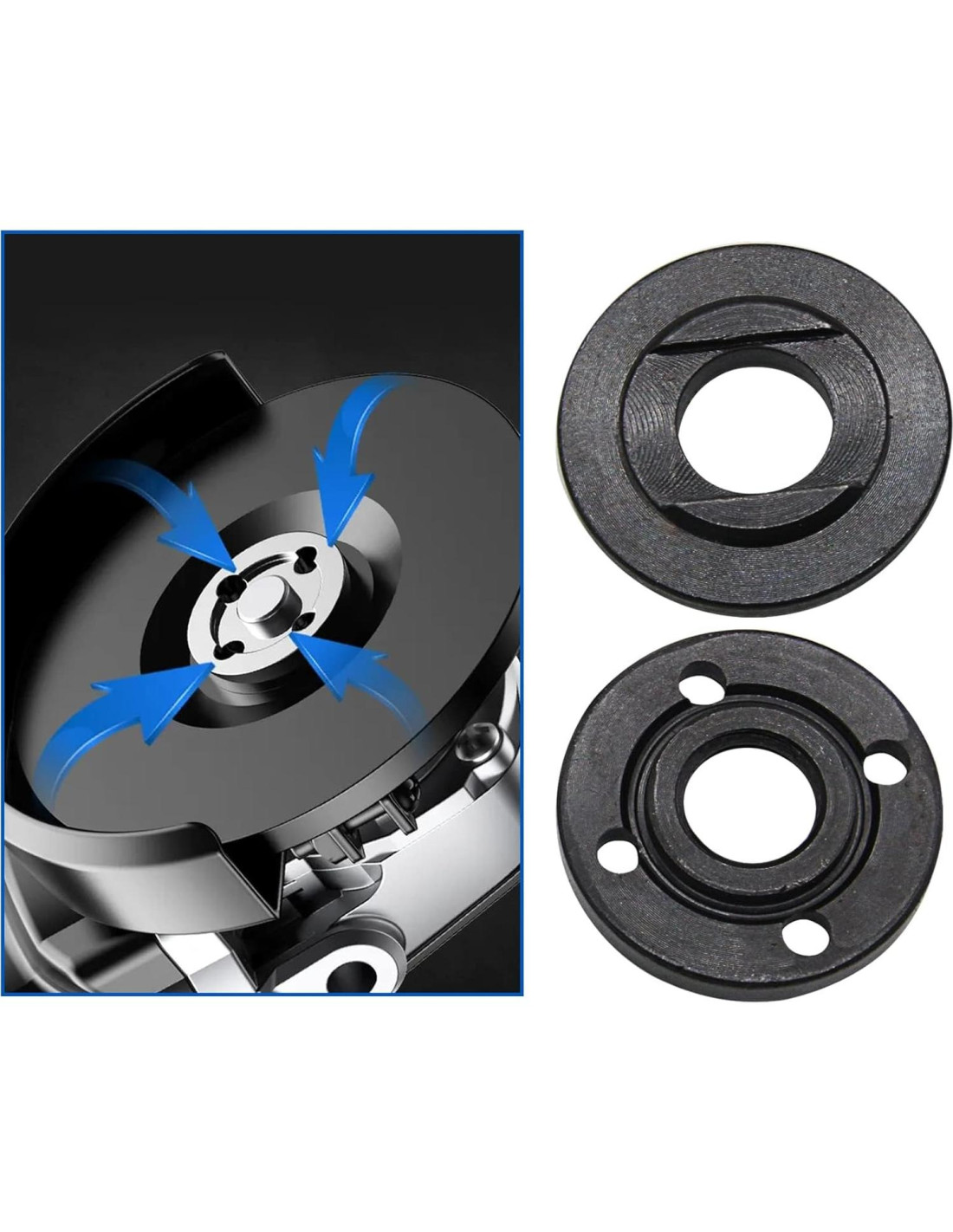 - Paquete Incluye: 1 x Llave de Flange para Amoladora; 1 x Tuerca de Flange Exterior para Amoladora; 1 x Tuerca de Flange Interior para Amoladora