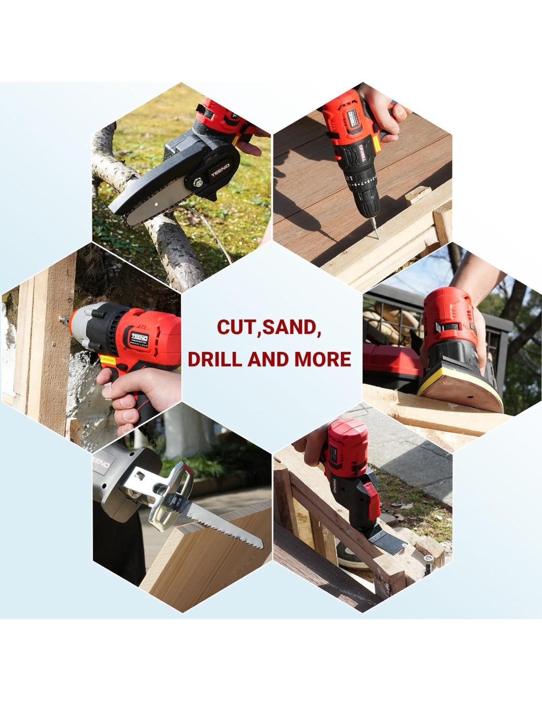 - Aplicaciones Multifuncionales y Multi-escenario - Al comprar nuestros productos, tendrás una amplia variedad de herramientas eléctricas a tu disposición, incluyendo taladro/atornillador de velocidad variable, llave de impacto, lijadora, sierra recíproca, sierra de cadena y herramienta oscilante, seis herramientas eléctricas inalámbricas para tu uso diario.
