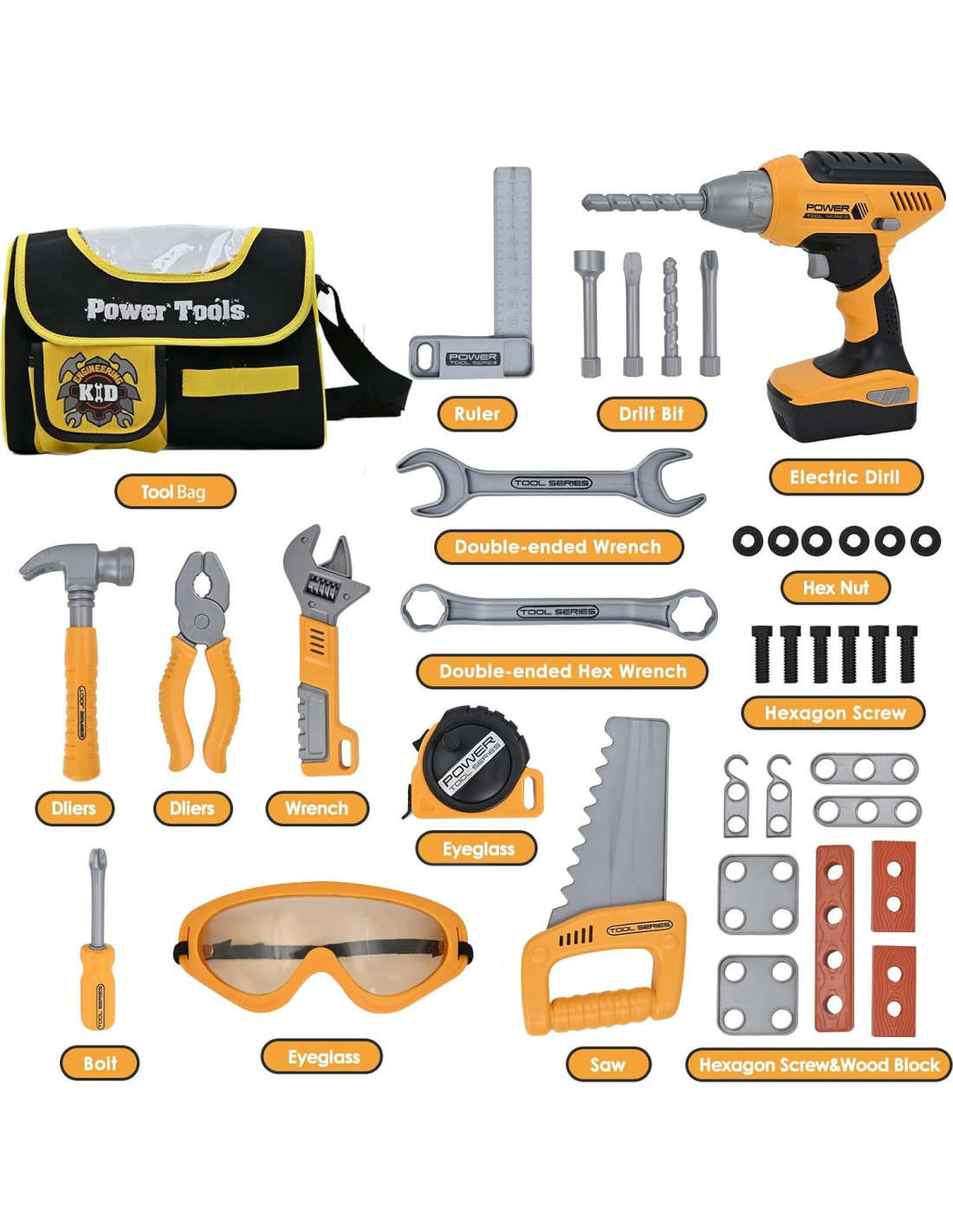 - [Bolsa de herramientas para niños] ¡Este juego de construcción para niños contiene todo lo que necesitas! Nuestras herramientas de construcción únicas para niños incluyen taladros eléctricos, martillos realistas, destornilladores y llaves de juguete, así como una variedad de astillas de madera, clavos, tuercas y más. ¡Es una gran idea de regalo para un niño pequeño y una gran idea de regalo para una niña pequeña que ama pasar tiempo con papá en el garaje.