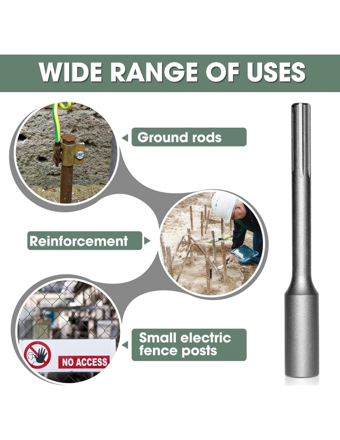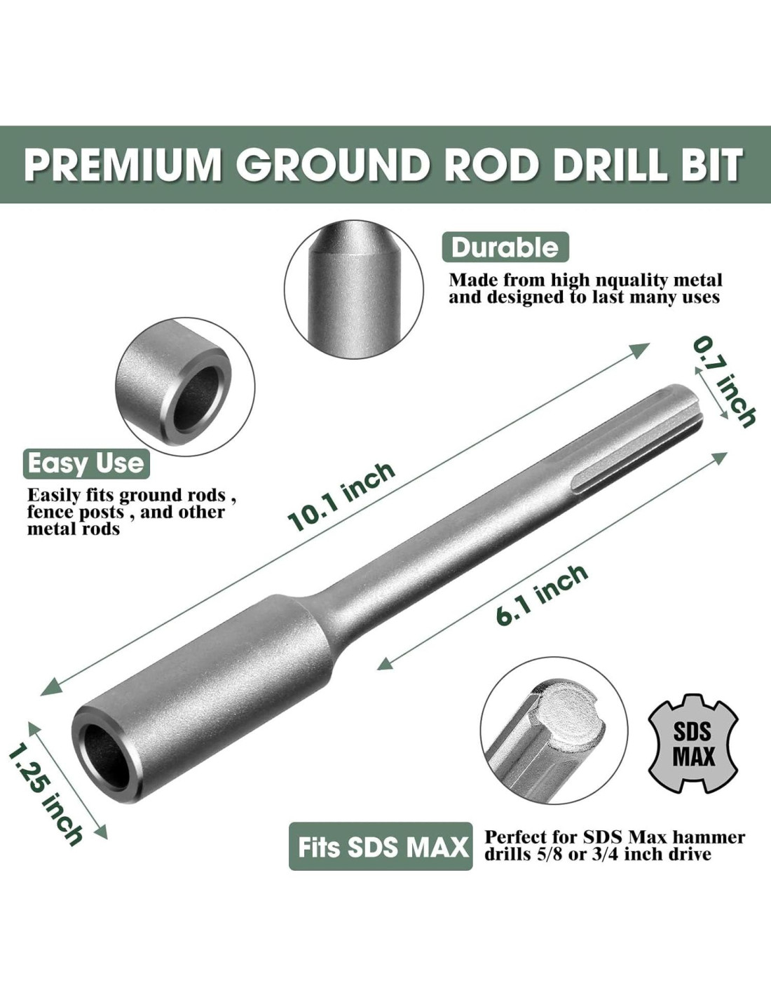 - Mango Universal SDS-MAX - Nuestro conductor de varilla de tierra se acopla rápida y seguramente a los martillos SDS-MAX de Bosch, Dewalt, Hitachi, Hilti, Makita, Milwaukee y otros, asegurando una amplia compatibilidad para su conveniencia.