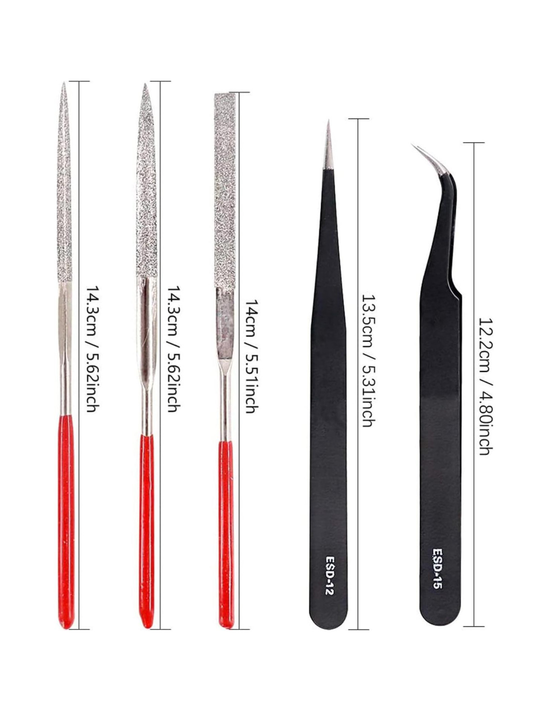 - Componentes incluidos: 1 taladro manual negro, 10 cabezales de taladro, 1 máquina de pulido eléctrica, 5 cabezales de pulido, 4 papeles de lija, 1 alfombrilla de corte, 1 alicates laterales, 2 destornilladores, 3 limas, 1 separador, 1 regla de acero, 2 barras pulidas negras, 1 barra pulida de doble cara, 2 pinzas, 1 cuchillo de hobby, 5 cuchillas de repuesto, 1 bolígrafo, 1 cuchillo mini, 1 paño de pulido