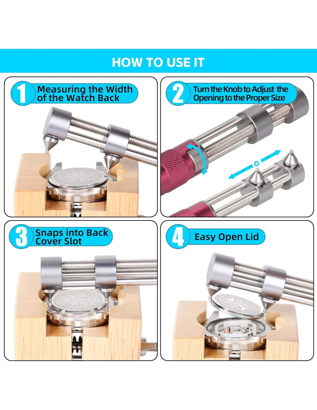 - [OPERACIÓN SIMPLE] : El abridor de fondo de reloj adopta un botón para ajustar la apertura y el cierre con alta precisión, y el botón de ajuste de apertura y cierre de la garra de acero permite que realmente puedas realizar un ajuste con una sola mano, lo que es más conveniente que otros abridores y cerradores.