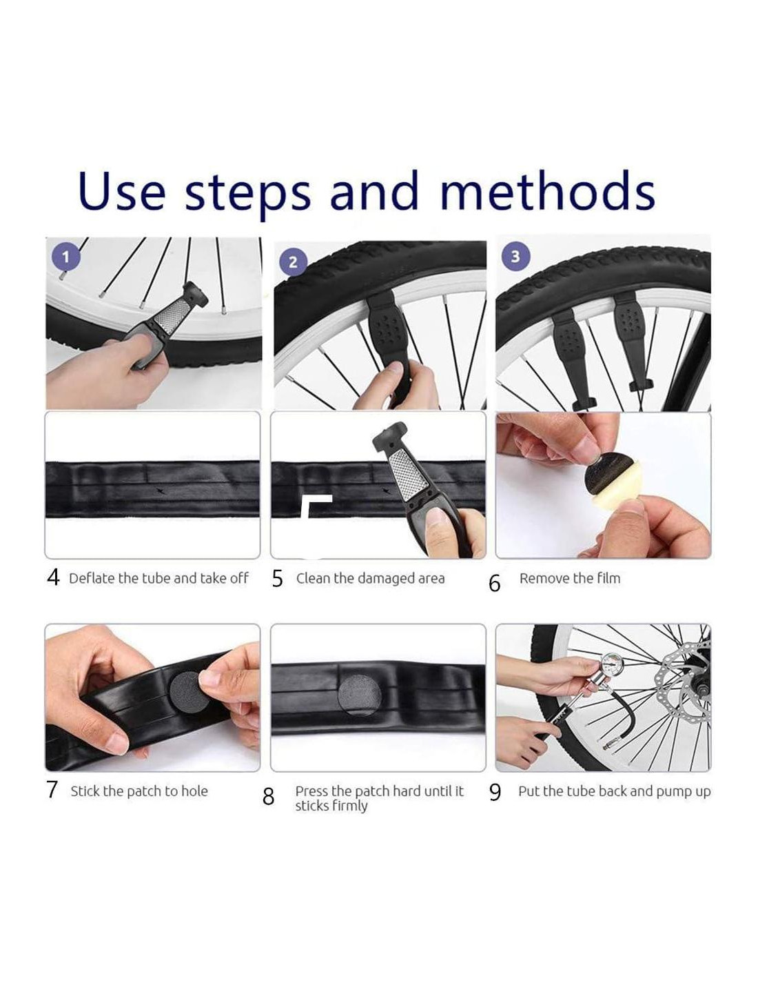 - PARCHE FÁCIL DE ADJUNTAR. puede reparar el neumático pinchado sin pegamento extra: solo aplique la lima para pulir el neumático y luego pegue firmemente el parche en el área pinchada (solo para uso de emergencia). Llave de hueso multifuncional con 10 tipos de usos (6-15). Todos los accesorios se pueden colocar en una bolsa de herramientas portátil para facilitar el transporte.
