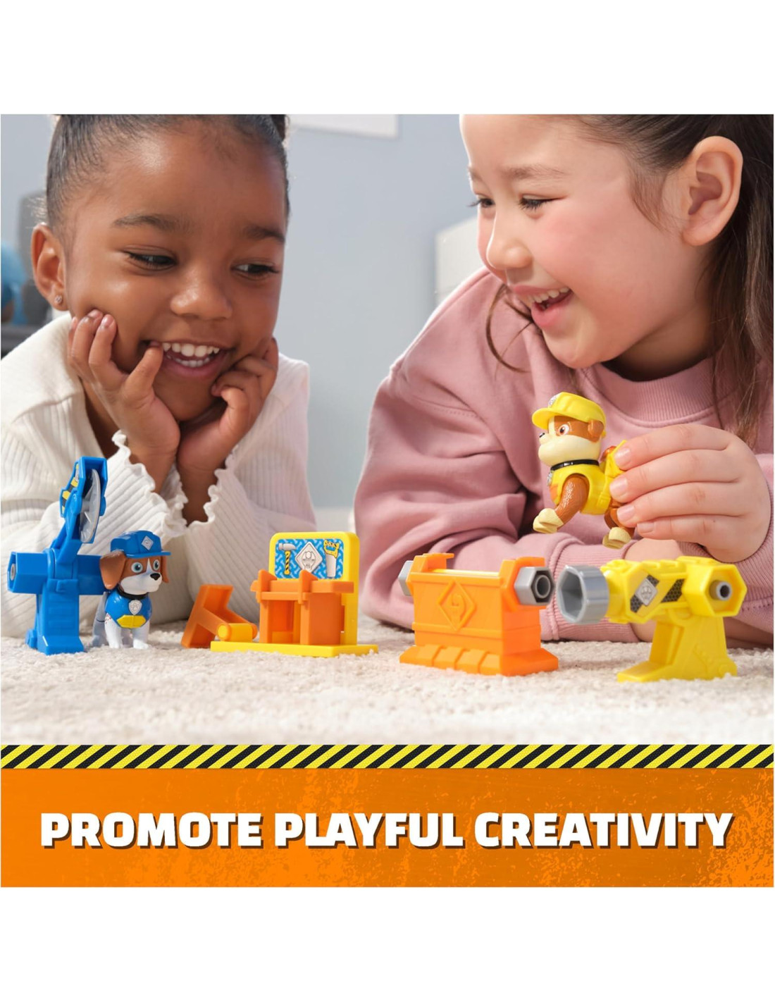 - FIGURAS CON CONDUCTORES DE HERRAMIENTAS INTEGRADOS: El set viene con figuras de juguete Rubble & Wheeler que miden más de 2 inches (5,08 cm) de altura y cuentan con mochilas de conductor de herramientas integradas que se activan al presionar hacia abajo a los cachorros