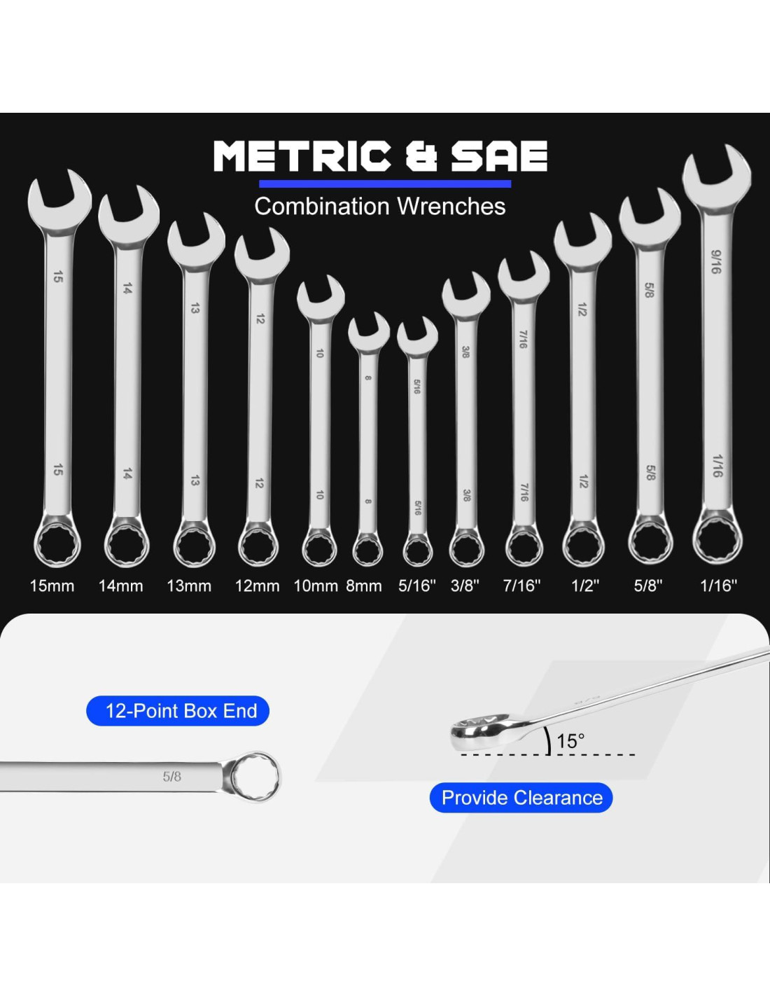 - [Variedades Completas] - El kit de herramientas de 240 piezas contiene tamaños mixtos de llaves combinadas SAE y métricas, una gama completa de enchufes de tamaño métrico y SAE de 1/4" (0,64 cm), 3/8" (0,95 cm) y 1/2" (1,27 cm) y trinquetes de 1/2" (1,27 cm) y 3/8" (0,95 cm), llave ajustable, alicates de bomba, destornilladores, alicates de punta larga, etc. Variedad de puntas de destornillador de 1/4" (0,64 cm): Phillips, ranurado, cuadrado, estrella y pozi.