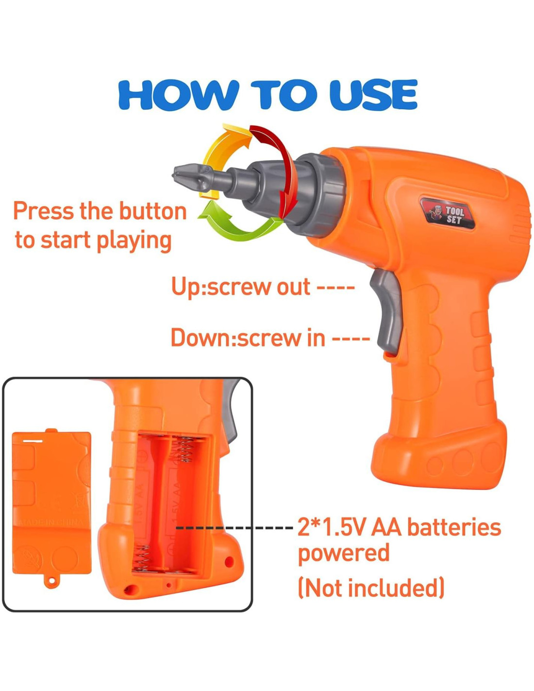 - Materiales Seguros, Duraderos y Amigables para Niños Todos los componentes están hechos de plástico ABS de primera calidad, libre de BPA y sin rebabas, asegurando un manejo seguro para manos pequeñas. El taladro funciona a baja velocidad para mayor seguridad infantil (requiere 2 baterías AA, no incluidas).