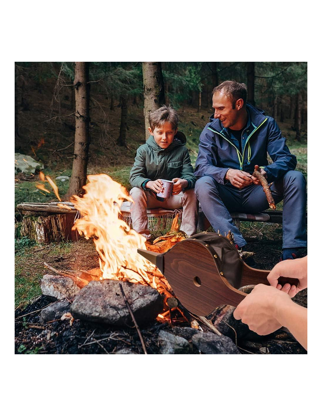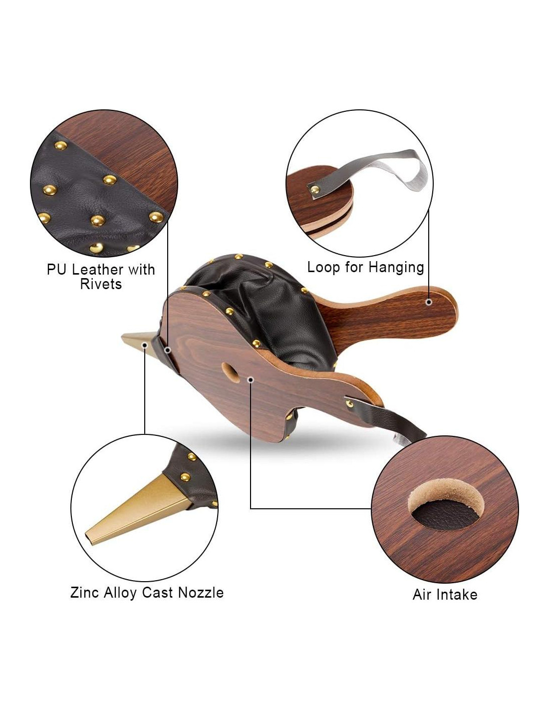 - [CARACTERÍSTICAS] El soplador de aire está hecho de un hermoso acabado en color madera, con boquilla de zinc fundido, fabricado con tablero de contrachapado y aspecto de cuero artificial negro con remaches. Perfecto tamaño de mano para kit de herramientas de barbacoa y lo suficientemente pequeño como para colgar junto a la chimenea, chimenea y estufa de leña.