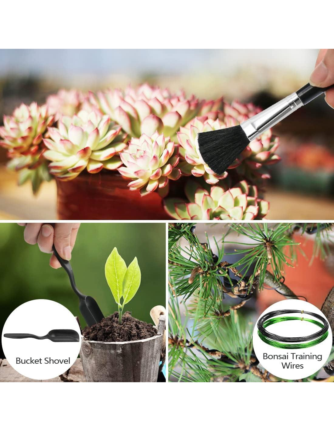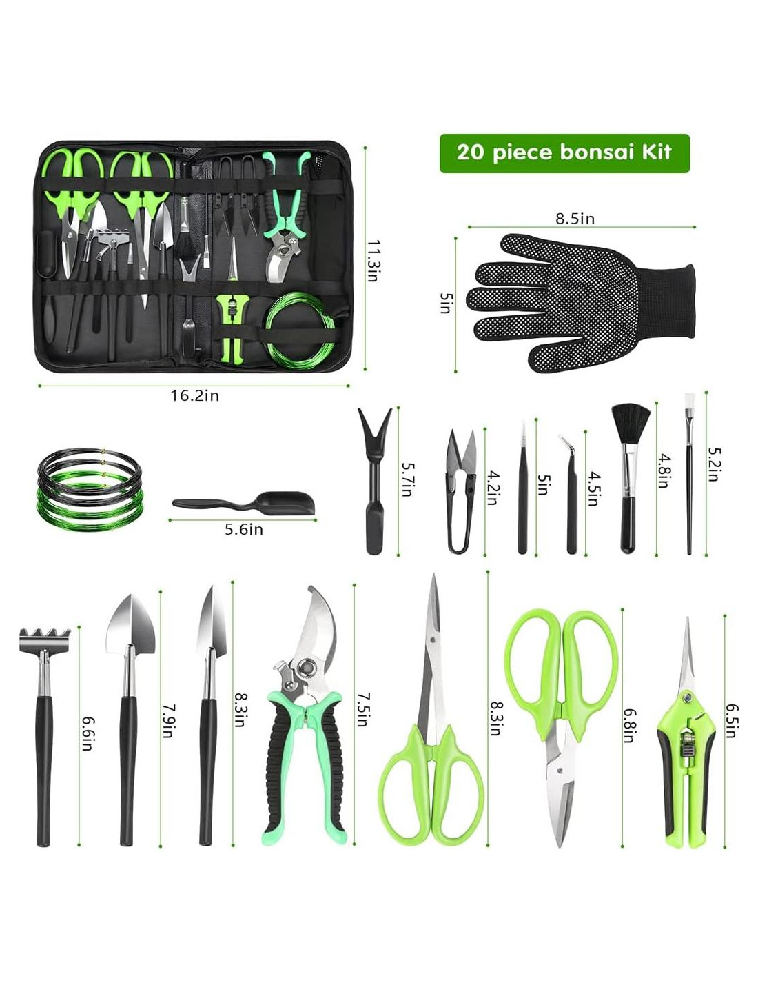 - Set de Herramientas de Jardinería de Gran Valor - El Kit de Bonsai incluye 4 x Alambre para Bonsai, 1 x Tijeras Grandes para Bonsai, 1 x Tijeras Rectas, 1 x Tijeras de Poda, 1 x Tijeras Largas, 1 par de guantes de jardín, 2 x Cortadores de Hojas, 1 x Mini Pala Ancha, 1 x Mini Pala, 1 x Mini Rastrillo, 2 x Brochas, 2 x Pinzas, 1 x Pala de Cubo, 1 x Iniciador de Plántulas, 1 x Bolsa Organizadora. Poseer este perfecto kit de bonsai es el comienzo de tu viaje con bonsais.