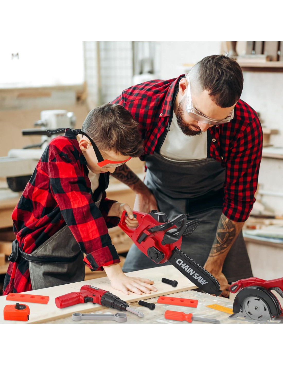 - Componentes incluidos: Motocierra de Juguete Eléctrica x1, Taladro de Juguete Eléctrico x1 (con 3 Brocas + 1 Cabeza de Sierra), Sierra Circular Inercial x1, Gafas x1, Orejeras x1, Máscara x1, Martillo x1, Alicates x1, Destornillador x1 (con 2 Cabezas de Destornillador), Lima x1, Llave Inglesa x2, Cinta Métrica x1, Tornillos x4, Tuercas x4, Clavos x2, Bloques x6.