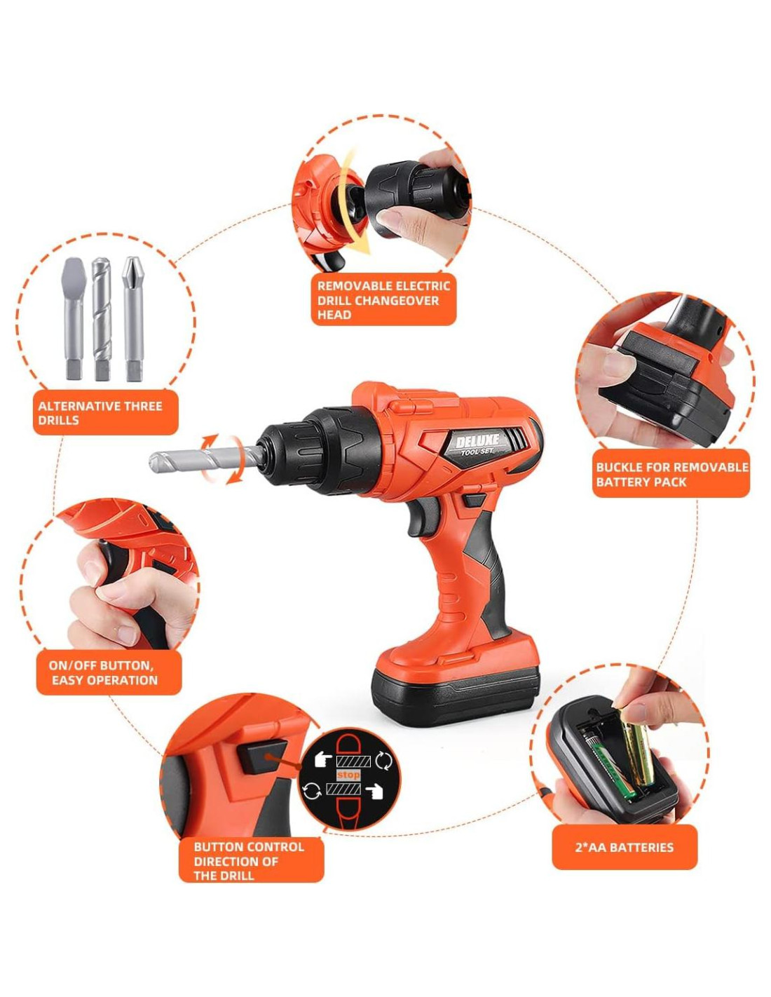 - Kit de Herramientas Portátil para Fácil Almacenamiento: La gran capacidad de la caja de herramientas te ayuda a almacenar juguetes de herramientas relativamente voluminosos. No importa dónde quieras llevar las herramientas, o si deseas limpiar después de jugar, el kit de herramientas portátil puede ayudarte a simplificar el procedimiento de almacenamiento. Te permite poner todos los accesorios en la caja de herramientas de juguete y solo ocupa un espacio muy pequeño en tu habitación.