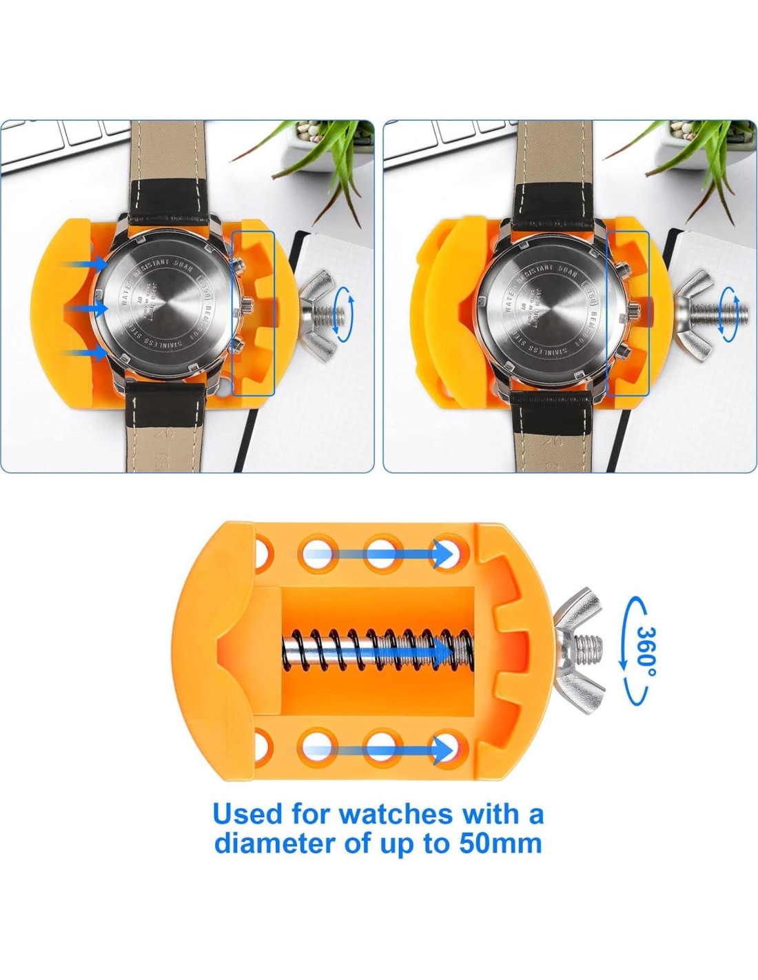 - Función del soporte para reloj: Con el soporte para reloj, el área de agarre es más grande, lo que puede generar más torque y ayudarte a abrir la tapa trasera del reloj de manera más cómoda y eficiente. Además, usar el soporte para reloj es más sólido que fijar el reloj directamente con la mano, lo que puede evitar efectivamente rasguños en el reloj y la mano debido al deslizamiento del reloj.