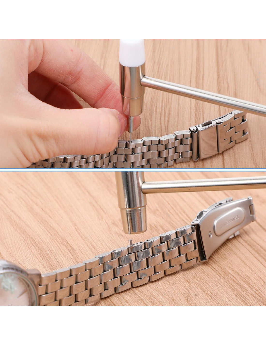 - Kit Completo de Eliminación de Eslabones de Reloj con Martillo y Herramientas: Este conjunto incluye todos los elementos esenciales para reparaciones de bricolaje: 1 removedor de correa de reloj, 1 martillo de doble cabeza, 2 herramientas de pasador de doble cabeza y 6 pasadores de repuesto. Ya sea para redimensionar o reemplazar correas, tendrás todas las herramientas listas en un kit compacto.