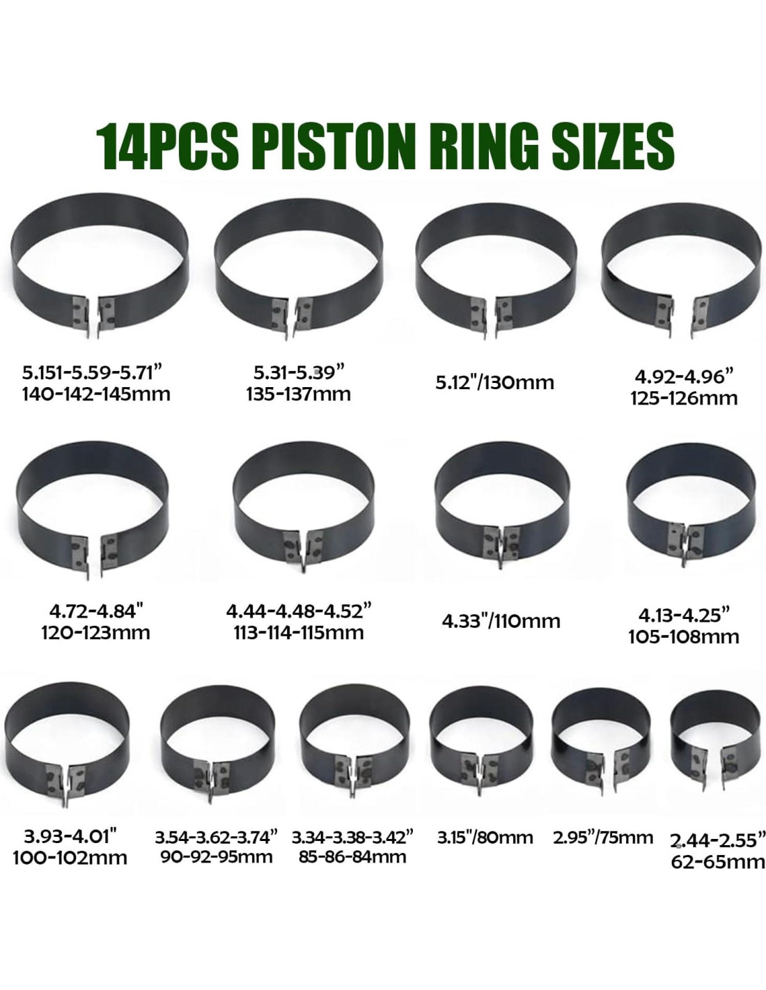 - 14 Tamaños de Anillos de Pistón: 14 tamaños diferentes de anillos de pistón están disponibles: 62-145mm (2.44-5.7 pulgadas) para su uso en diferentes tipos de motores de automóviles (Por favor, verifique la información de su modelo de automóvil para elegir el tamaño correcto)