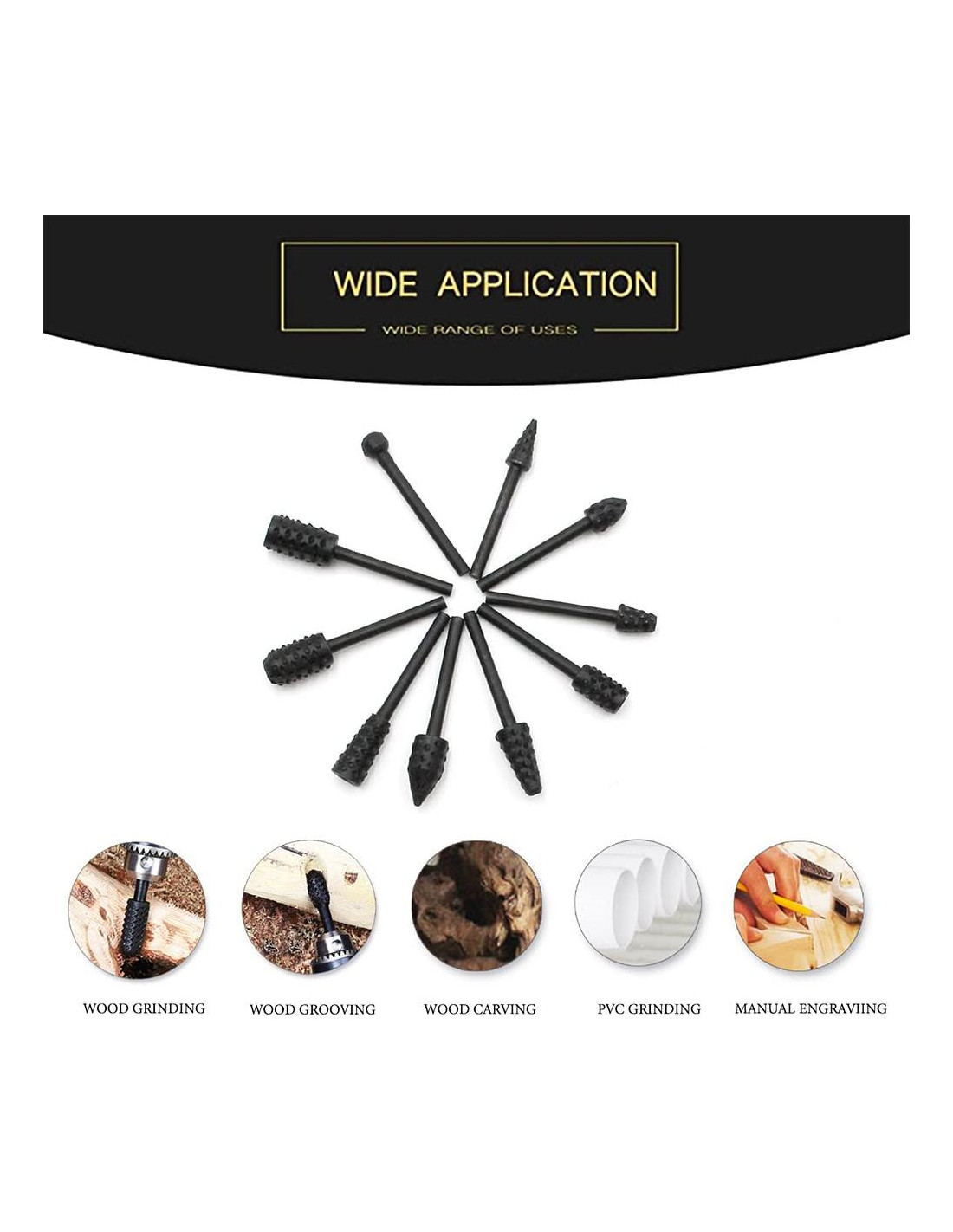 Set de 10 PCS Mini Rotary Wood Rasp Drill Bit para Carpintería ESPECIFICACIÓN TAMAÑO DEL Vástago: 1/8 pulgada (3 mm); TAMAÑO DE LA CABEZA: 1/4"-1/3" (6mm-8mm) COLOR: Negro CARACTERÍSTICAS DEL PRODUCTO: - [GRANDES BITS PARA CARPINTERÍA Y TALLADO EN MADERA]- 10 PCS Wood Rasp de varias formas se pueden usar para moler, pulir, dar forma, agrandar y abrillantar madera blanda, plásticos y superficies de goma. Ideal set de burros de archivo rotativo para trabajos de carpintería DIY; - [MATERIAL RESISTENTE]- Set de 10 PCS de burros de carburo rotativo hecho de material de acero de alta velocidad de grado industrial con tratamiento de superficie negra, resistente, afilado, robusto, asegurando una larga vida útil; - [VARIAS FORMAS DE CABEZA]- El paquete incluye varias formas de cortador- Bola, Oval, Cilindro, Cono y más para satisfacer tus diversas necesidades; excelente para procesar una variedad de cavidades de molde de alta precisión; - [TAMAÑO DEL Vástago]- Todos los 10 bits de perforación de rasp de madera tienen un vástago de 1/8" (3MM); Tamaño de la Cabeza: 1/4"-1/3" (6mm-8mm), adecuado para la mayoría de las herramientas rotativas pequeñas; - [NOTA]- Este set rotativo funciona bien para madera blanda. No los apliques a madera dura o metal.