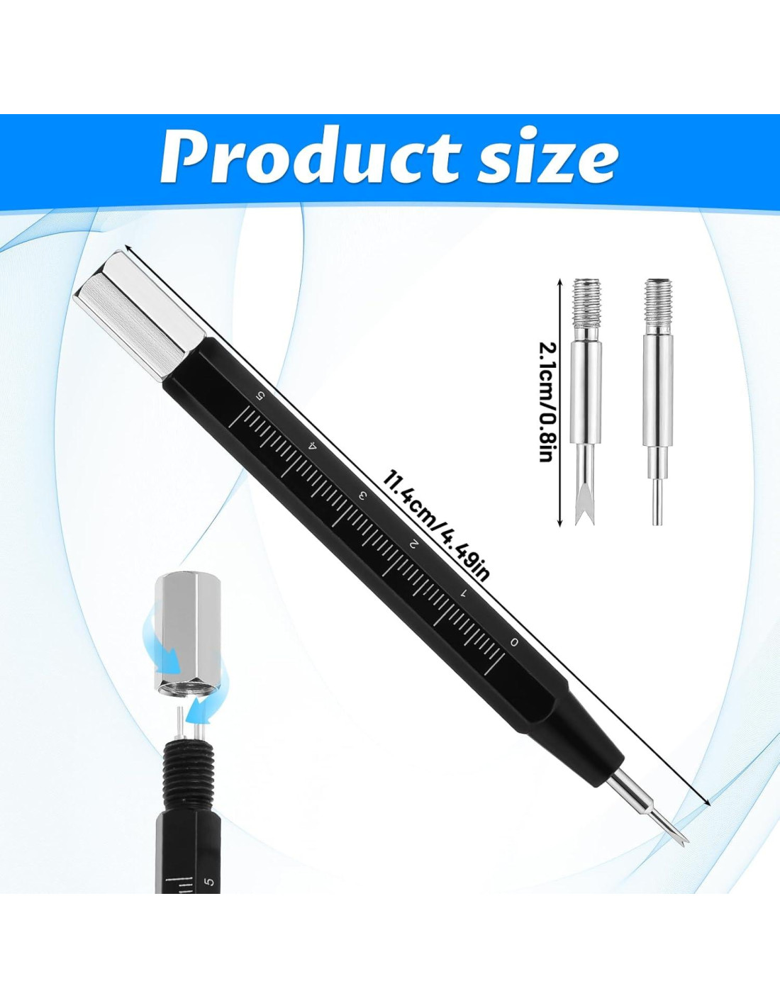 - Diseño de regla de medición: El tamaño de la herramienta para correas de reloj es de 11.5cm (4.5 pulgadas), y hay una escala de 5cm en el mango de la herramienta, lo que es conveniente para medir el tamaño de los pasadores de resorte y las correas de reloj