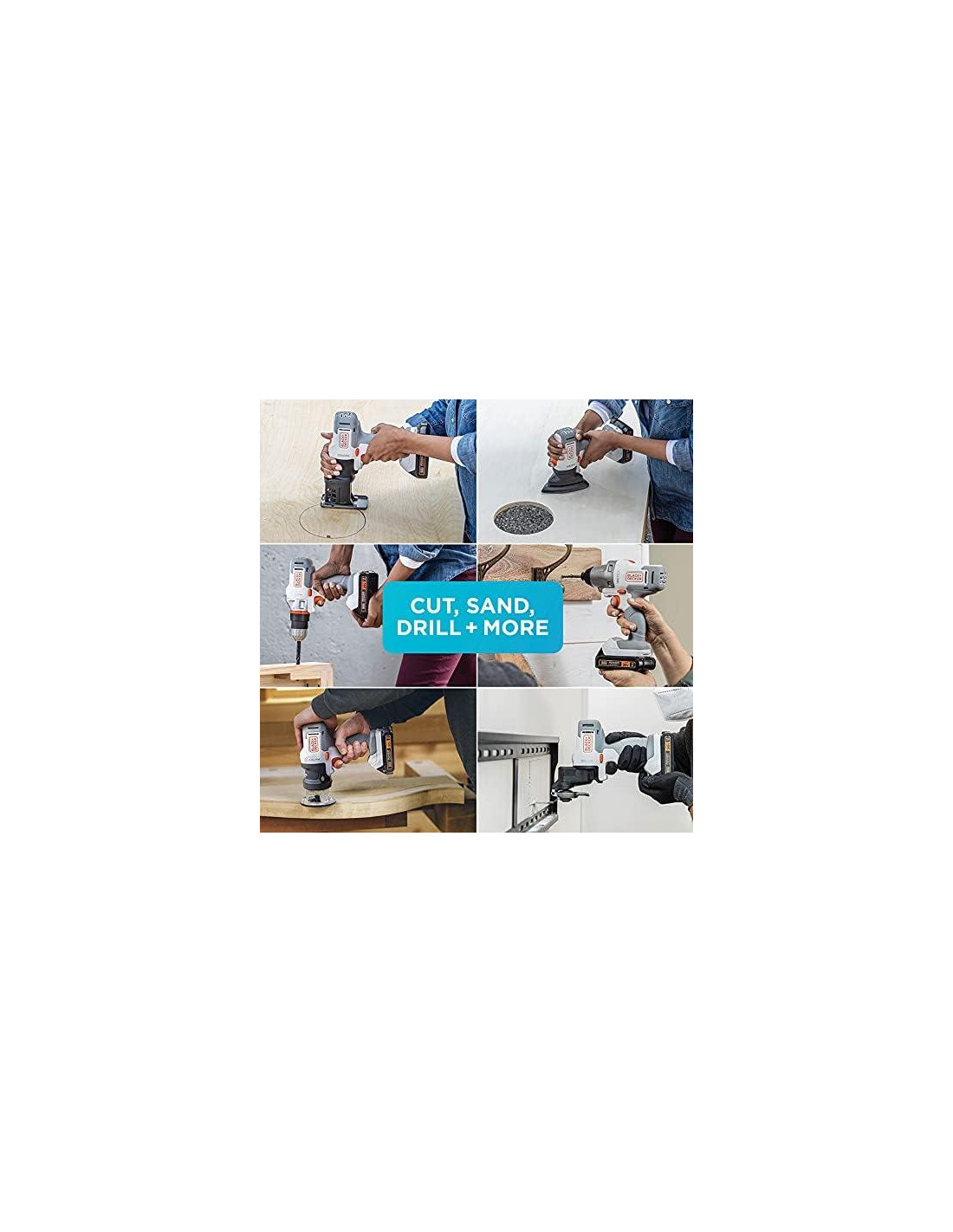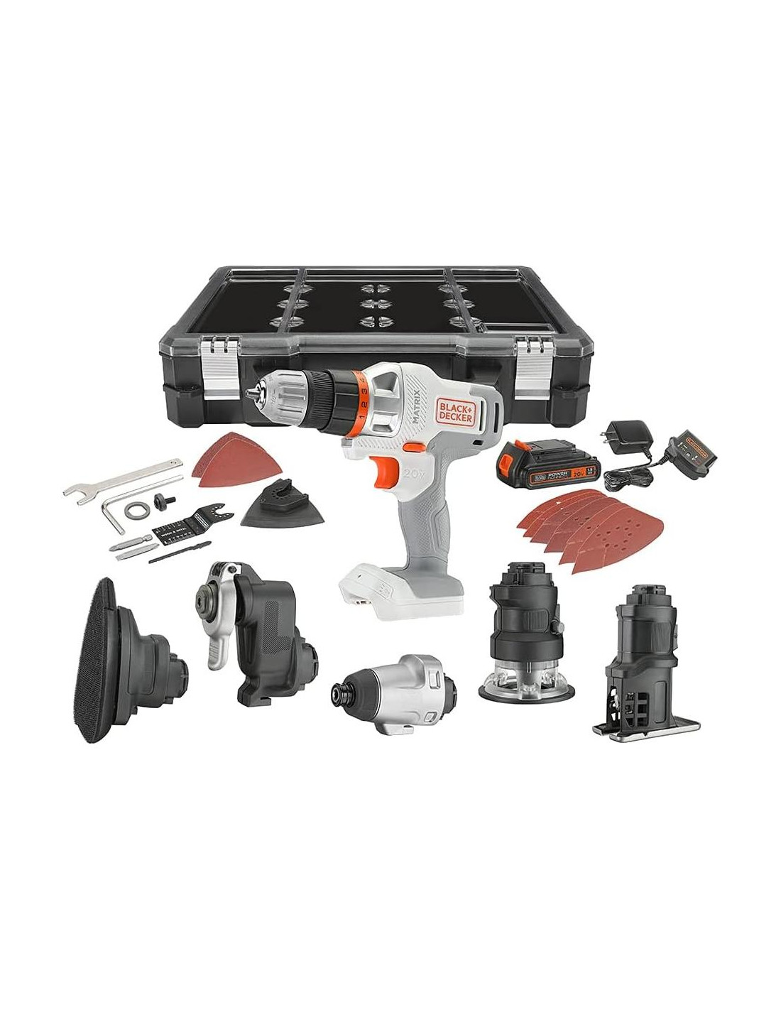 - Componentes incluidos: 6 ACCESORIOS INCLUIDOS: (1) Accesorio de Taladro/Conductor BDCMTDD, (1) Accesorio de Lijadora de Detalle BDCMTS, (1) Accesorio de Sierra de Calar BDCMTJS, (1) Accesorio Oscilante BDCMTO, (1) Accesorio de Destornillador de Impacto BDCMTI, y (1) Accesorio de Fresadora BDCMTR, ACCESORIOS INCLUIDOS: (1) Punta de Destornillador de Doble Extremo, (6) Hojas de Papel de Lija: 60/120/240 grano (1) Hoja de Sierra de Calar para Madera, (1) Adaptador Universal Oscilante, (1) Hoja de Corte Oscilante de 3/8 pulgadas (0.95 cm) para Madera/Metal, (1) Placa de Lijado, (2) Hojas de Papel de Lija para el accesorio oscilante: 60/240 grano, (1) Hoja de Sierra de Calar para Madera, (1) Adaptador Universal Oscilante, (1) Hoja de Corte Oscilante de 3/8 pulgadas (0.95 cm) para Madera/Metal, (1) Placa de Lijado, (2) Hojas de Papel de Lija para el accesorio oscilante: 60/240 grano, (1) Punta de Destornillador Philips de 2 pulgadas (5.08 cm), (1) Llave de Fresadora, (1) Batería de Litio-Ion 20V MAX de 1.5 Ah, (1) Caja de Almacenamiento.