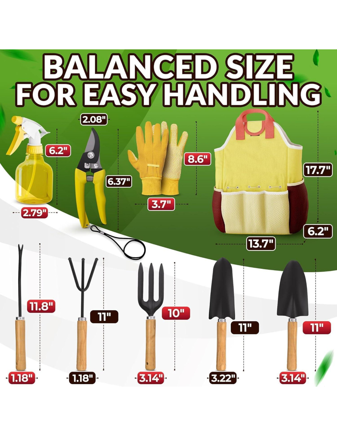 - Juego de Jardinería Integral de 9 Piezas: Nuestro conjunto de suministros de jardinería incluye un desherbador, tenedor de mano, rastrillo de mano, trasplantador, pala, podadora, botella de spray y un par de guantes, ofreciendo un manejo fácil de las tareas