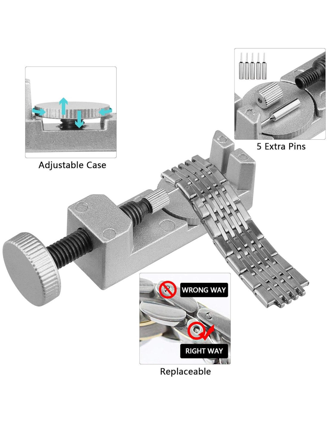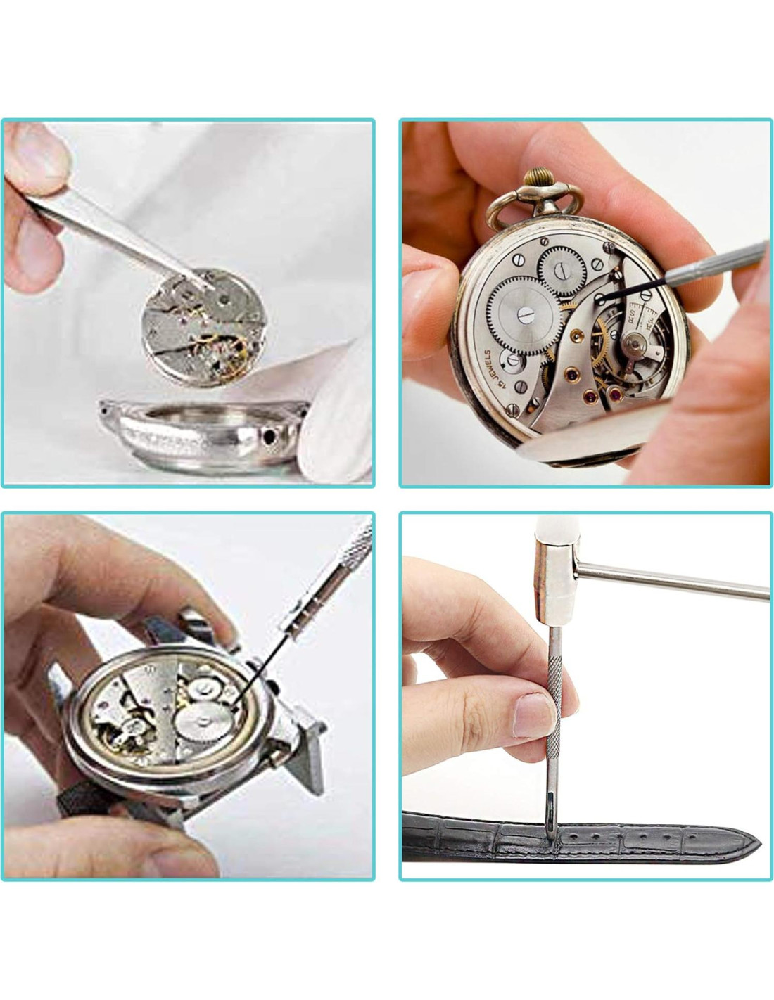 - Kit de Reparación de Relojes Integral: Este kit de herramientas de 151 piezas incluye todo lo que necesitas para ajustar correas de relojes, abrir cajas, reemplazar baterías y más. Cuenta con un punch de cuero para correas de reloj, herramienta de barra de resorte, abridor de caja ajustable, removedor de eslabones y soporte para caja de reloj, lo que lo hace adecuado para todas tus necesidades de reparación de relojes.