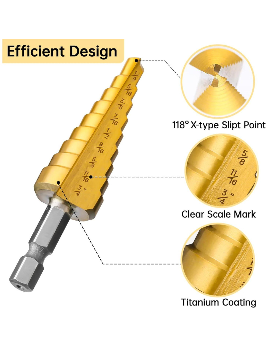 - Recubrimiento de Titanio HSS: La broca escalonada tiene una excelente nitidez y durabilidad debido a su material de acero de alta velocidad y recubrimiento de titanio