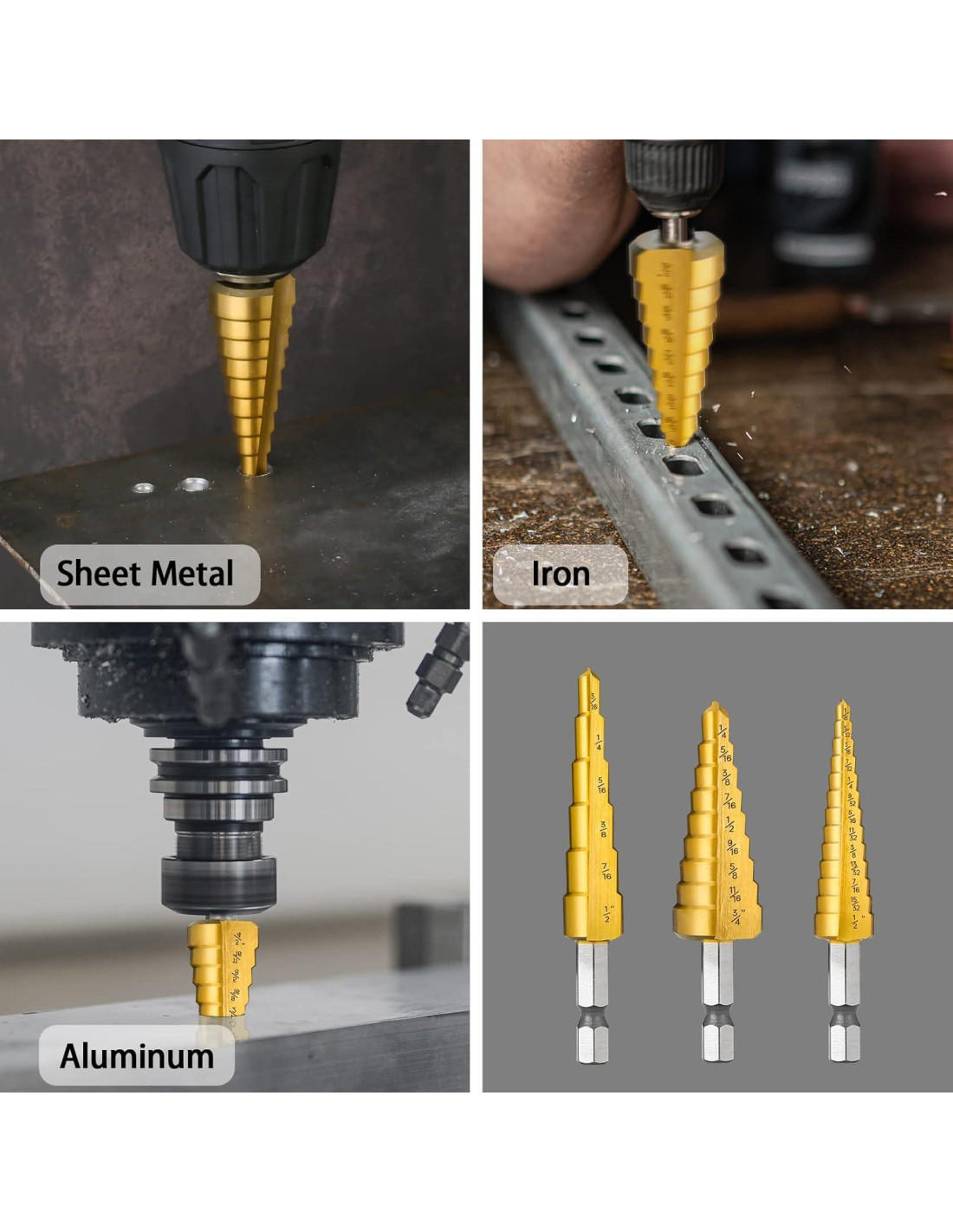 - El juego incluye: #1 Broca (13 pasos): 1/8" (3.18 mm), 5/32" (3.97 mm), 3/16" (4.76 mm), 7/32" (5.56 mm), 1/4" (6.35 mm), 9/32" (7.14 mm), 5/16" (7.94 mm), 11/32" (8.73 mm), 3/8" (9.53 mm), 13/32" (10.32 mm), 7/16" (11.11 mm), 15/32" (11.90 mm), 1/2" (12.70 mm); #2 Broca (6 pasos): 3/16" (4.76 mm), 1/4" (6.35 mm), 5/16" (7.94 mm), 3/8" (9.53 mm), 7/16" (11.11 mm), 1/2" (12.70 mm); #3 Broca (9 pasos): 1/4" (6.35 mm), 5/16" (7.94 mm), 3/8" (9.53 mm), 7/16" (11.11 mm), 1/2" (12.70 mm), 9/16" (14.29 mm), 5/8" (15.88 mm), 11/16" (17.46 mm), 3/4" (19.05 mm)