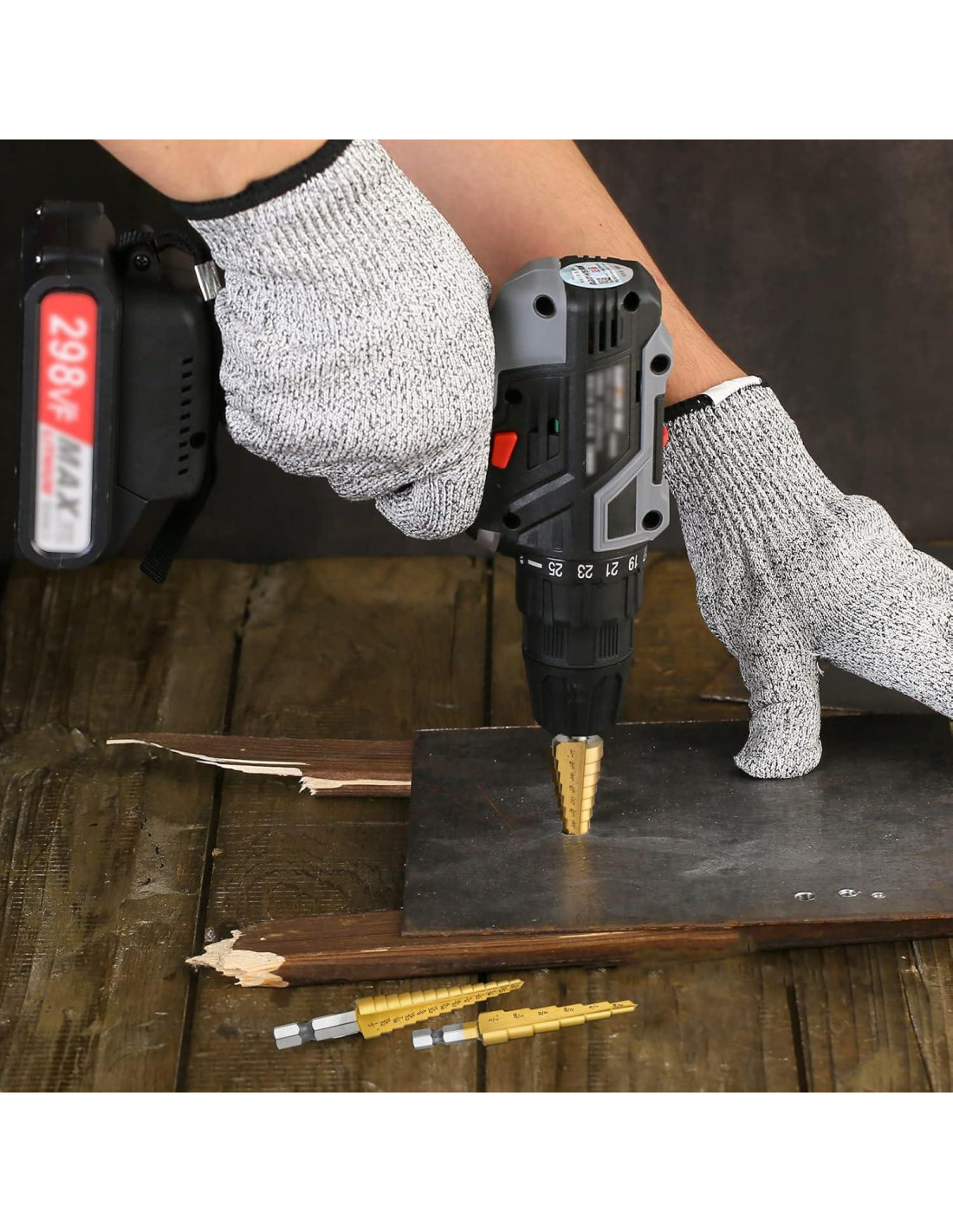Para extender la vida útil de la broca escalonada y facilitar la perforación, es mejor agregar aceite antes de usarla. Cuando se trabaja con una broca escalonada, es necesario agregar agua para mantener la temperatura baja. #1 Broca: 1/4" (6.35 mm), 5/16" (7.94 mm), 3/8" (9.53 mm), 7/16" (11.11 mm), 1/2" (12.70 mm), 9/16" (14.29 mm), 5/8" (15.88 mm), 11/16" (17.46 mm), 3/4" (19.05 mm) #2 Broca: 1/8" (3.18 mm), 5/32" (3.97 mm), 3/16" (4.76 mm), 7/32" (5.56 mm), 1/4" (6.35 mm), 9/32" (7.14 mm), 5/16" (7.94 mm), 11/32" (8.73 mm), 3/8" (9.53 mm), 13/32" (10.32 mm), 7/16" (11.11 mm), 15/32" (11.90 mm), 1/2" (12.70 mm) #3 Broca: 3/16" (4.76 mm), 1/4" (6.35 mm), 5/16" (7.94 mm), 3/8" (9.53 mm), 7/16" (11.11 mm), 1/2" (12.70 mm) Punta Dividida en X de 118 - Aumenta la velocidad de corte con auto-centramiento y previene el deslizamiento. Diseño de Doble Canal - un corte más rápido y suave, permite que las partículas escapen fácilmente. El vástago hexagonal no girará dentro del mandril, compatible con diferentes tipos de máquinas de perforación de manera efectiva. Aplicación - adecuado para chapa metálica, plástico, aleación de aluminio, cobre, NO recomendado para acero de alto carbono, metal duro.