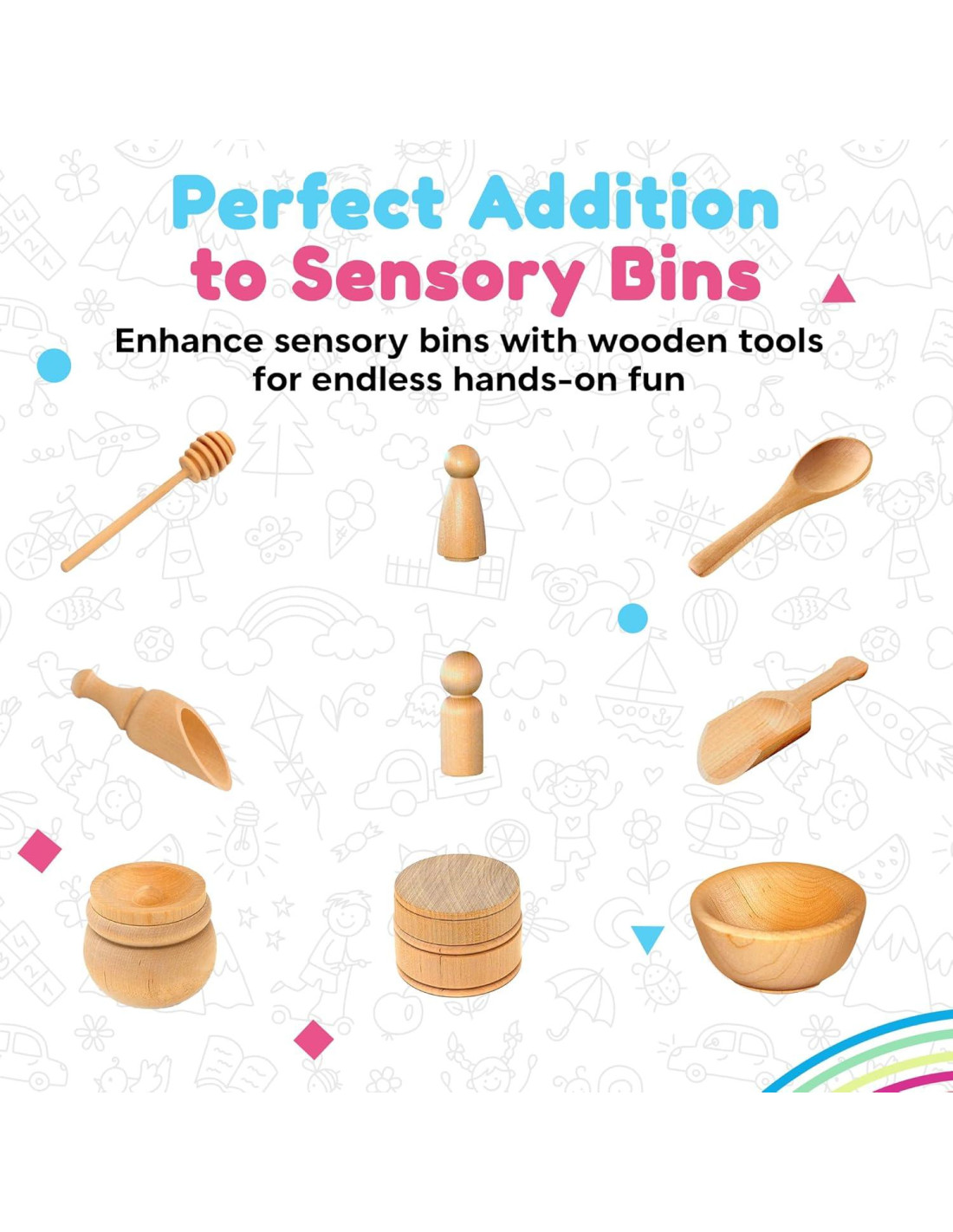 - Herramientas de Madera de Tamaño Infantil: Este juego de herramientas de madera está diseñado para manos pequeñas, facilitando a los niños practicar habilidades motoras finas como scooping, vertiendo y cavando. Estos accesorios para caja sensorial proporcionan una experiencia de juego más cómoda y promueven el desarrollo a través del juego.