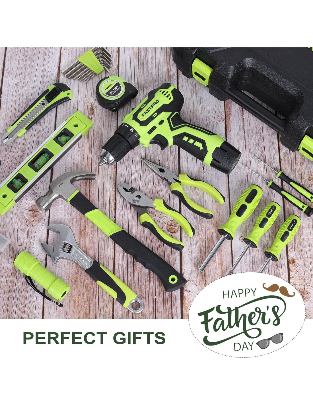El kit de herramientas FASTPRO con taladro de 12V contiene casi todas las herramientas manuales básicas que necesitas para trabajar y proyectos de bricolaje en casa. El kit de herramientas con taladro es perfecto para tu uso en casa o como regalos. Ideal para atornillar, cortar, doblar plomería, satisface tu proyecto de mantenimiento automotriz y del hogar. El juego de destornilladores contiene la mayoría de los tamaños de uso diario, hojas de acero cromo-vanadio con un gran mango para un agarre fácil. El martillo cuenta con un acero al carbono de alta resistencia para durabilidad. Todas las herramientas satisfacen tus necesidades para proyectos domésticos cotidianos, reparaciones y tareas de bricolaje. Cuchillo retráctil con 10 hojas extra, para cortar cajas, cartón, goma, etc. Linterna mini para un respaldo de emergencia en tus cajones en casa. Juego de Taladro de 12V. Juego de Taladro de 20V. Juego de Taladro de 12V. Juego de Taladro de 20V. Juego de Herramientas. Juego de Herramientas. Juego de Herramientas.