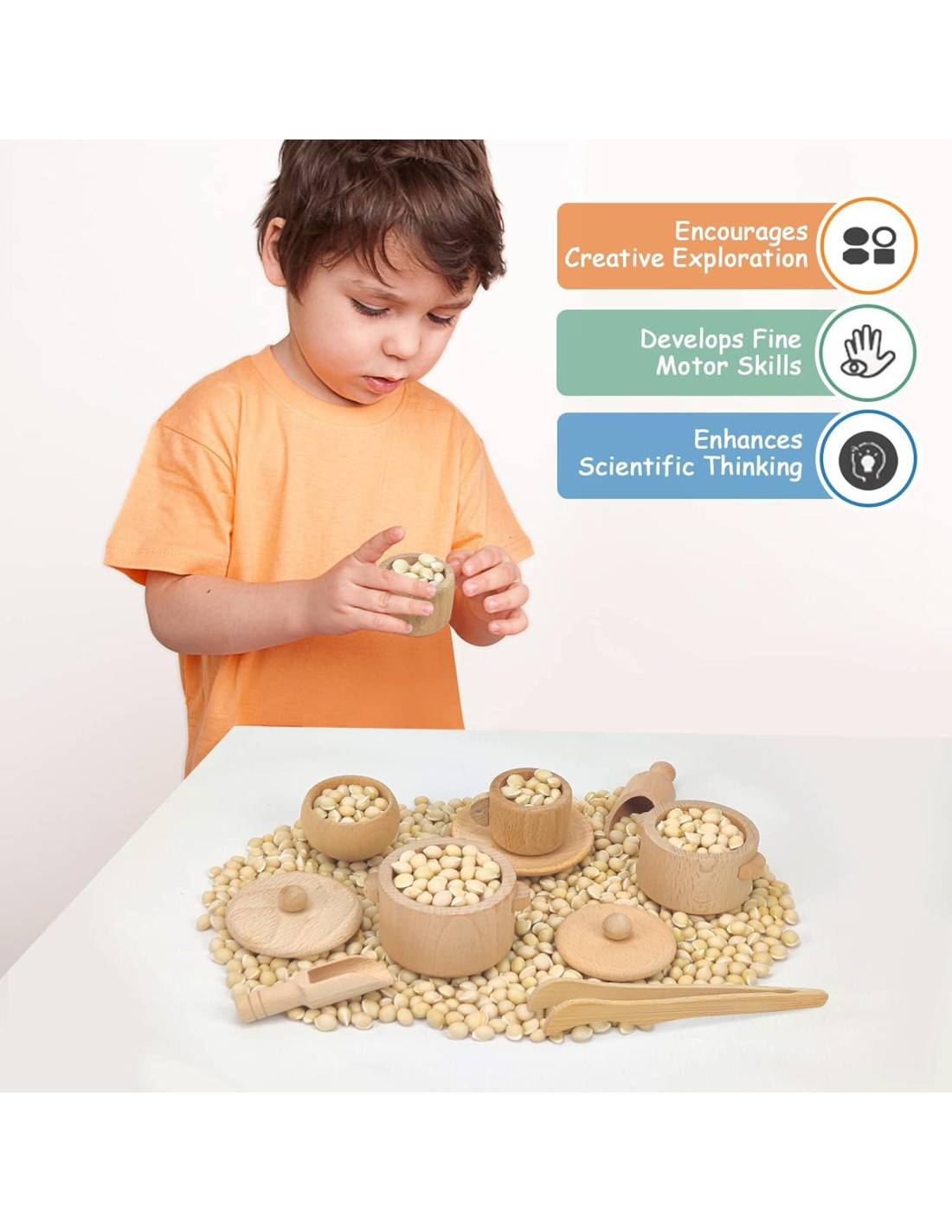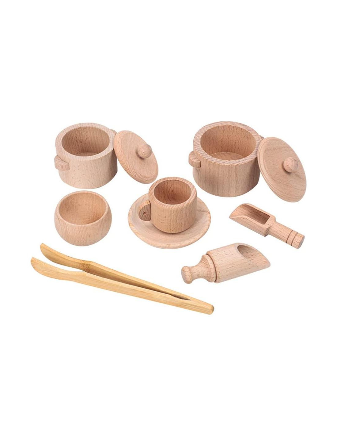 - Juguetes Sensoriales para Niños Pequeños: Herramientas de bin sensorial de madera que incluyen pinzas, contenedores y otros objetos pequeños que simulan habilidades motoras finas y juego sensorial. Juguetes de madera más pequeños que los utensilios de cocina, ideales para que los niños pequeños los agarren y muevan, ayudando a desarrollar habilidades de la vida real
