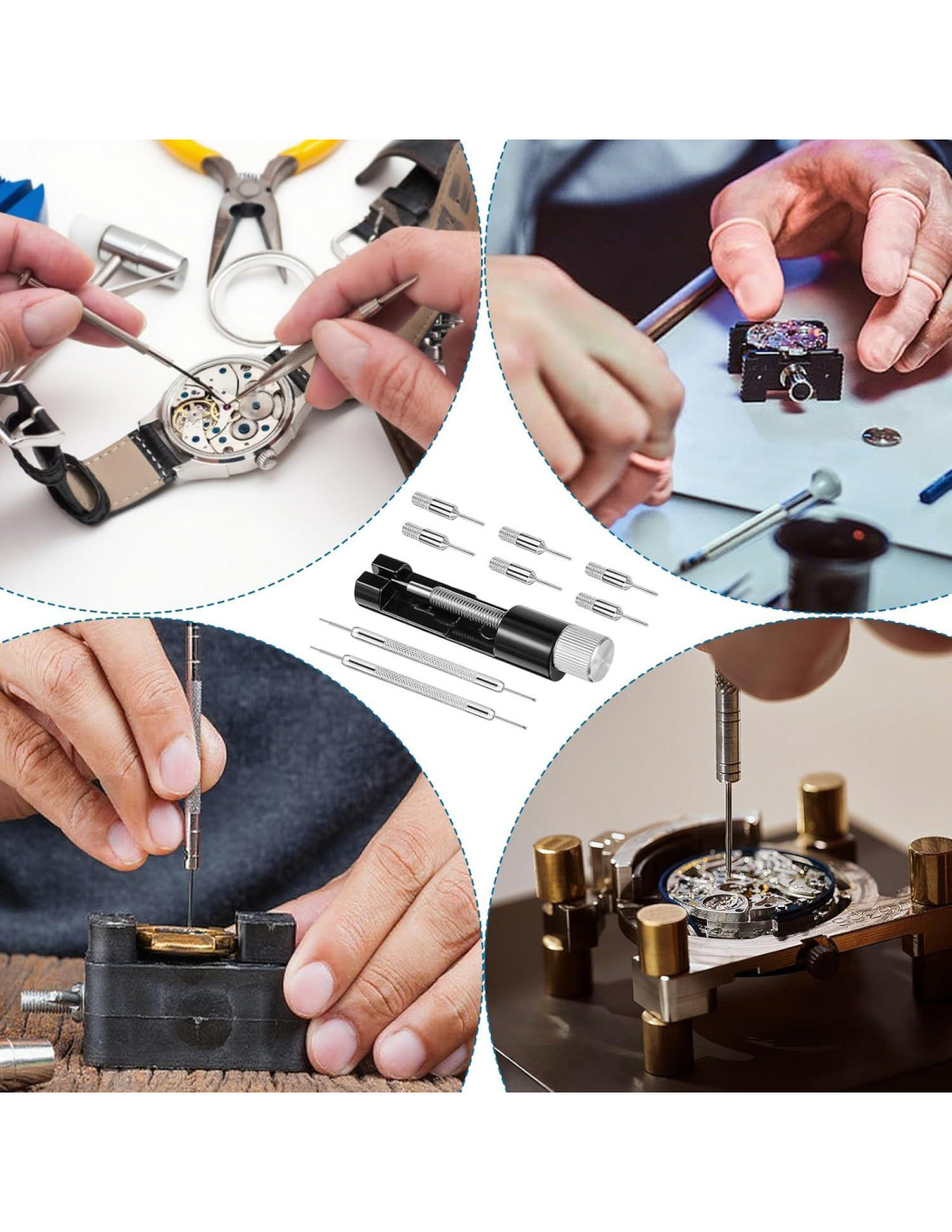 - [Lo que recibirás] Este kit de eliminación de eslabones de correa de reloj todo en uno incluye 2 herramientas de eliminación de eslabones de correa de reloj, 6 pasadores de reemplazo y 2 punzones de pasador de doble cabeza. Este kit de herramientas de reparación de relojes puede ahorrarte tiempo y dinero. Permite ajustes precisos, lo que lo hace ideal para relojeros profesionales y entusiastas del bricolaje.