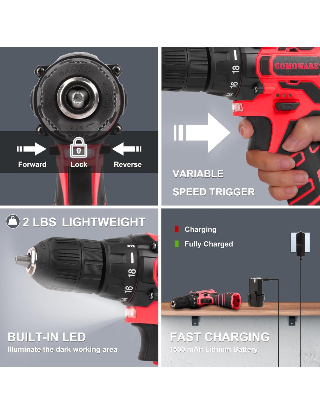 - Kit de Taladro Todo en Uno: Este kit de taladro inalámbrico incluye herramientas manuales esenciales para varios proyectos de bricolaje y tareas del hogar, lo que lo hace perfecto para principiantes y profesionales por igual.