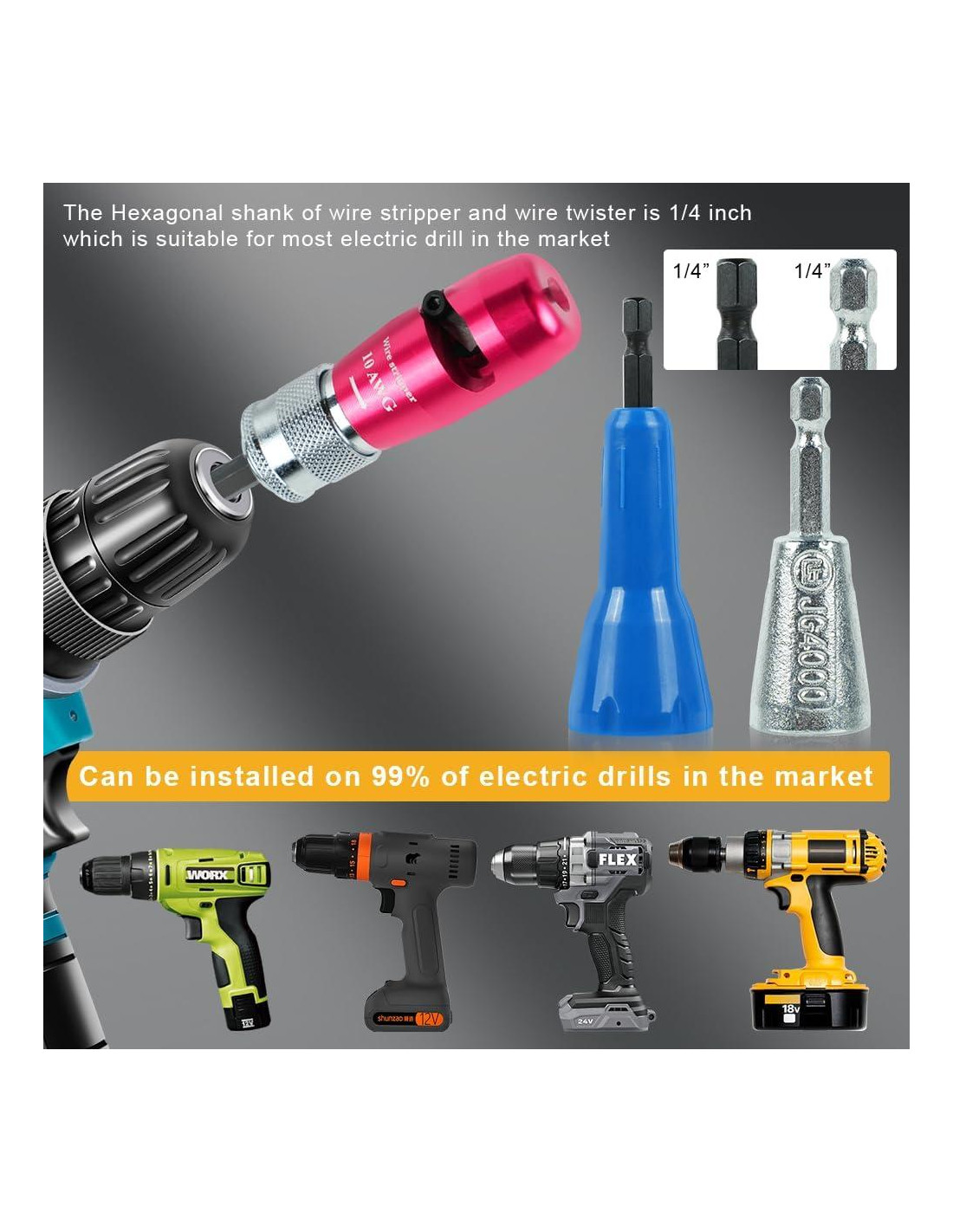 - [Alta Compatibilidad] Los lados del vástago hexagonal tanto de la herramienta destripadora de cables como del torcedor son de 1/4 pulgadas (6.35 mm), lo que es adecuado para la mayoría de los taladros eléctricos en el mercado, por lo que no hay preocupación de no poder usarlo después de la compra.