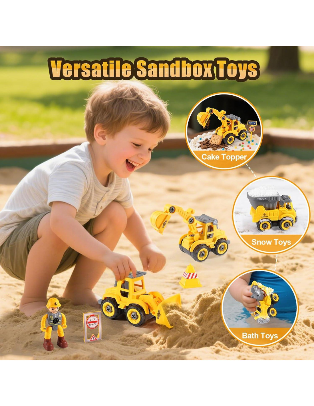 - CONJUNTO DE JUGUETES DE CONSTRUCCIÓN VALIOSO: Juguetes atractivos para desmontar para niños de 3 4 5 años, incluye 4 camiones de construcción, 2 figuras de trabajadores, 4 señales de tráfico y taladros, construye como Excavadora, Bulldozer, Mezcladora de Cemento y Camión Volquete al mismo tiempo, ¡genial para el juego de simulación! ABS liso y grueso no lastima a tus pequeños, cumple con el estándar de juguetes de EE. UU. de CPSIA y ASTM, juguetes para niños super seguros de 3-5 años