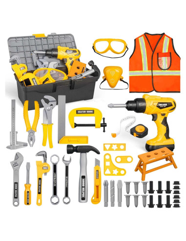 - Super valor con ricos accesorios: Este juego de herramientas de construcción de 48 piezas incluye todo lo que necesitas. El kit de herramientas con mango, un taladro eléctrico, disfraz de trabajador de construcción, martillo, destornilladores, gafas, máscara protectora y una variedad de accesorios. ¡Todo es completamente funcional y realista!
