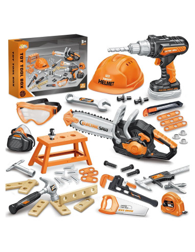- Kit de Herramientas para Niños de Gran Valor: Hay 51 piezas de juguetes de herramientas en una caja delicada. Incluye un taladro eléctrico y una motosierra (baterías no incluidas), gafas, máscara, martillo, destornilladores, llave inglesa, cinta métrica, calibrador y una variedad de piezas de madera, clavos, tuercas, etc. Estas herramientas para niños satisfarán sus necesidades y curiosidades. Perfecto juego de herramientas de regalo para niños de 3, 4, 5, 6, 7, 8 años.