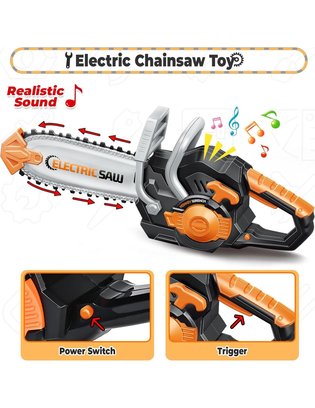 - Juego de Motosierra y Taladro de Juguete Realista: La motosierra de juguete y el taladro son no solo realistas en apariencia, sino que también cuentan con funcionalidad y sonido realistas. Inicia la motosierra tirando del cordón y presionando el gatillo para la acción de cadena rotativa. El taladro incluye 3 puntas intercambiables con sonidos de zumbido realistas. La combinación de estas herramientas eléctricas para niños es adecuada para el juego de roles para niños de 3 años en adelante como ingenieros.