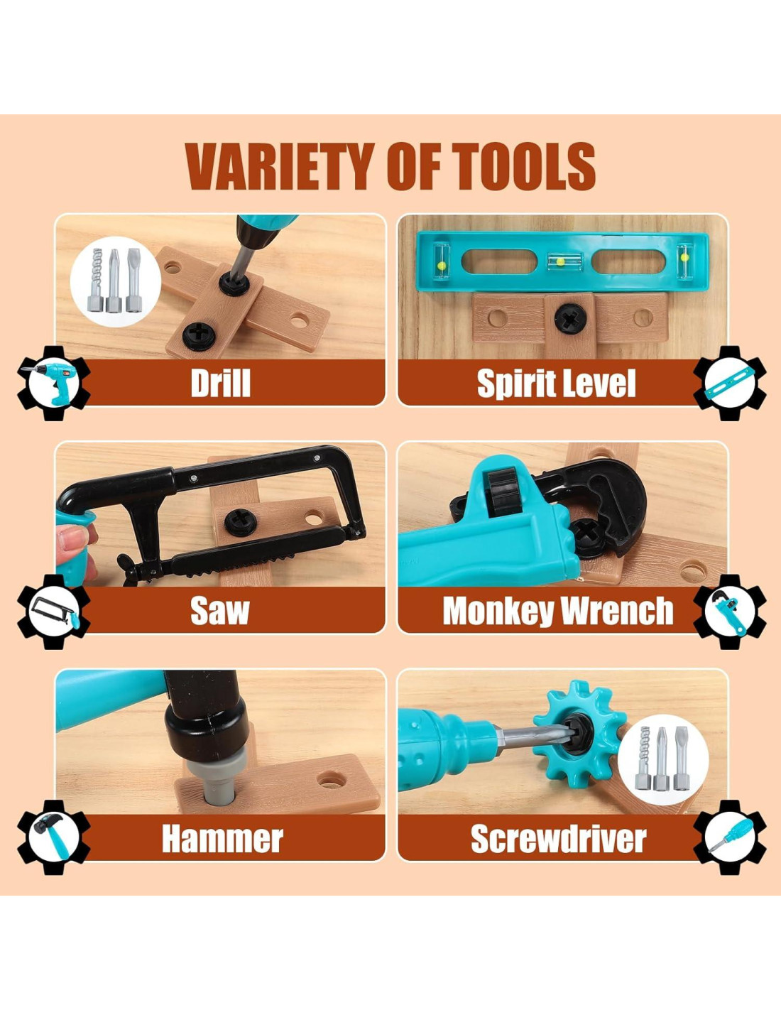 - Juego de Herramientas para Niños con Todos los Accesorios: Nuestro kit de herramientas de construcción incluye todo lo que su pequeño manitas necesita para jugar a ser, incluyendo taladro de inercia, brocas, martillo de juguete, destornillador, llave inglesa, sierra, nivel, tornillos, tuercas, pernos, engranajes y bloques de construcción. ¡Este juego de herramientas todo incluido despierta una creatividad infinita!